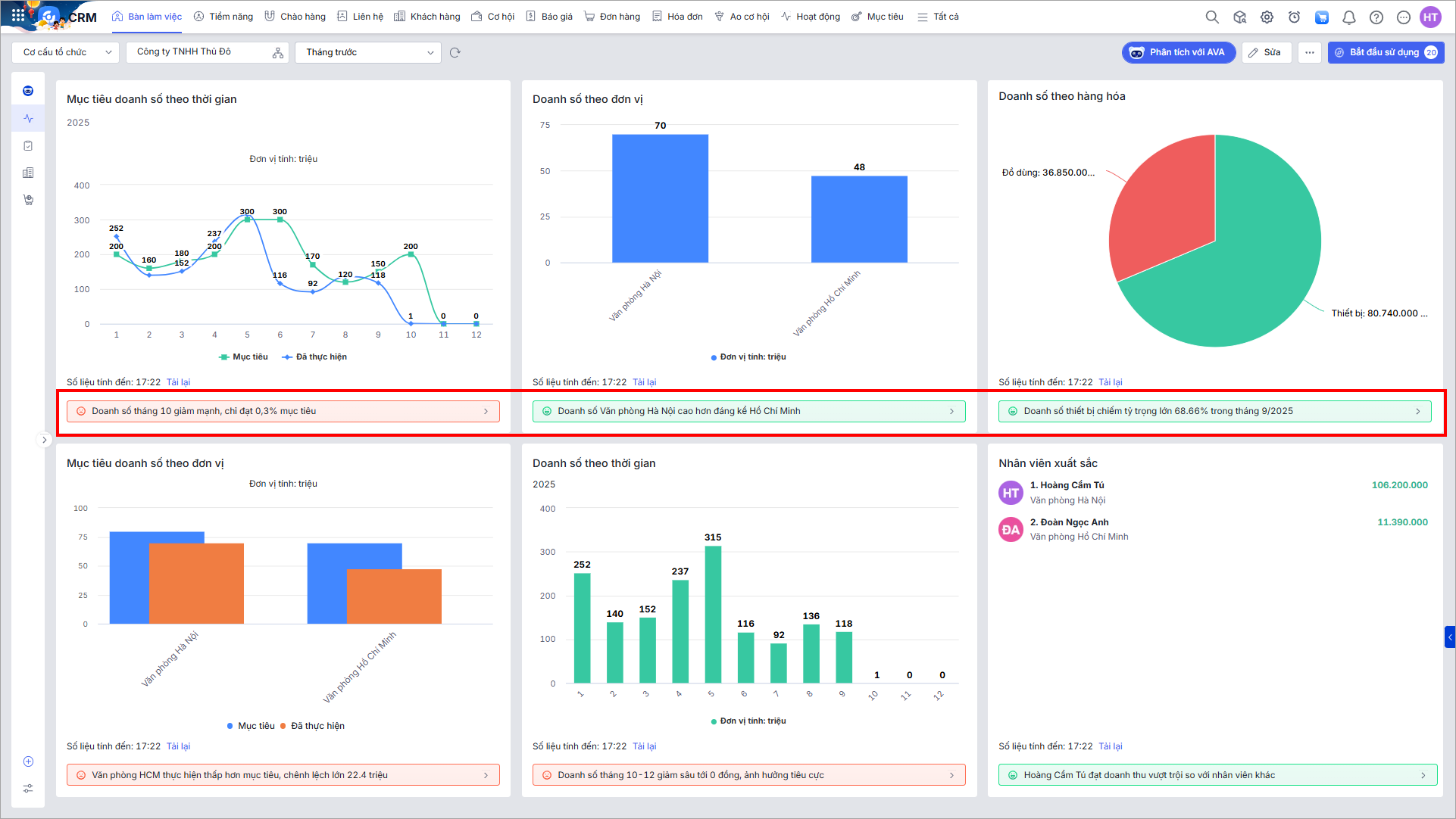 AMIS CRM tích hợp AI phân tích dữ liệu biểu đồ trên Bàn làm việc, giúp tóm tắt các biến động quan trọng và đánh giá trạng thái kinh doanh (tích cực, ổn định, tiêu cực). Tính năng này hỗ trợ quản lý nhanh chóng nhận diện các điểm đáng chú ý trong hoạt động kinh doanh.
