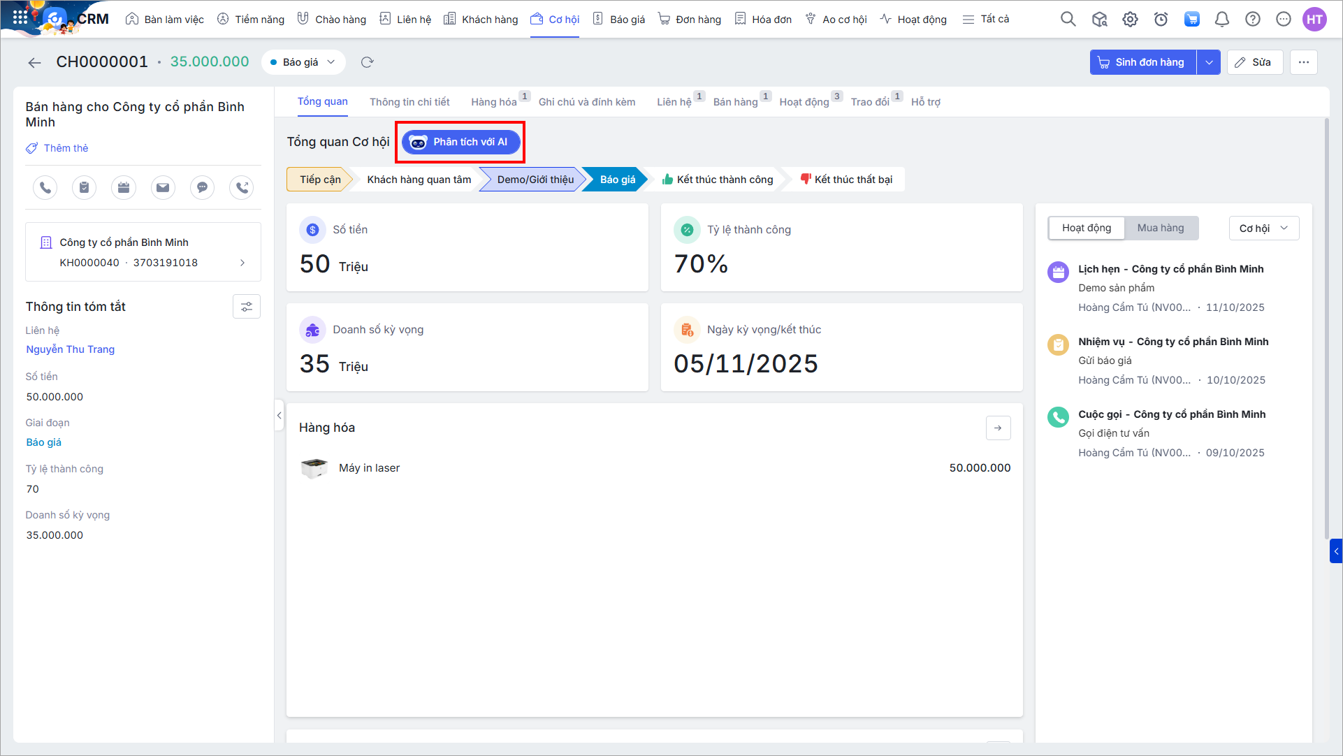 Ở chi tiết Cơ hội\tab Tổng quan, nhấn Phân tích với AI.