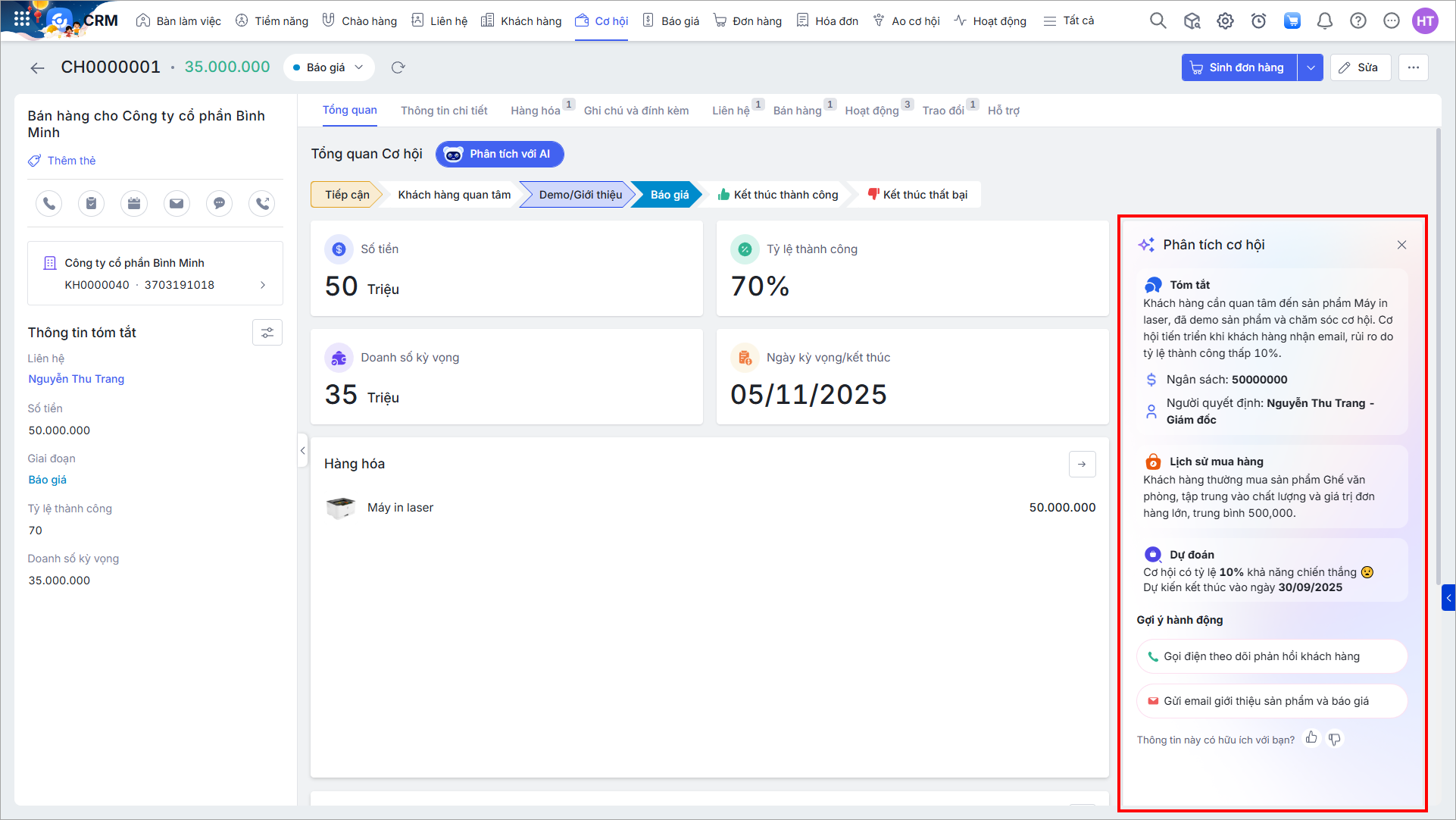 Gợi ý hành động: AI gợi ý hành động (gọi điện, gửi email, lập lịch hẹn, thêm công việc) mà NVKD nên thực hiện để tăng hiệu quả bán hàng.