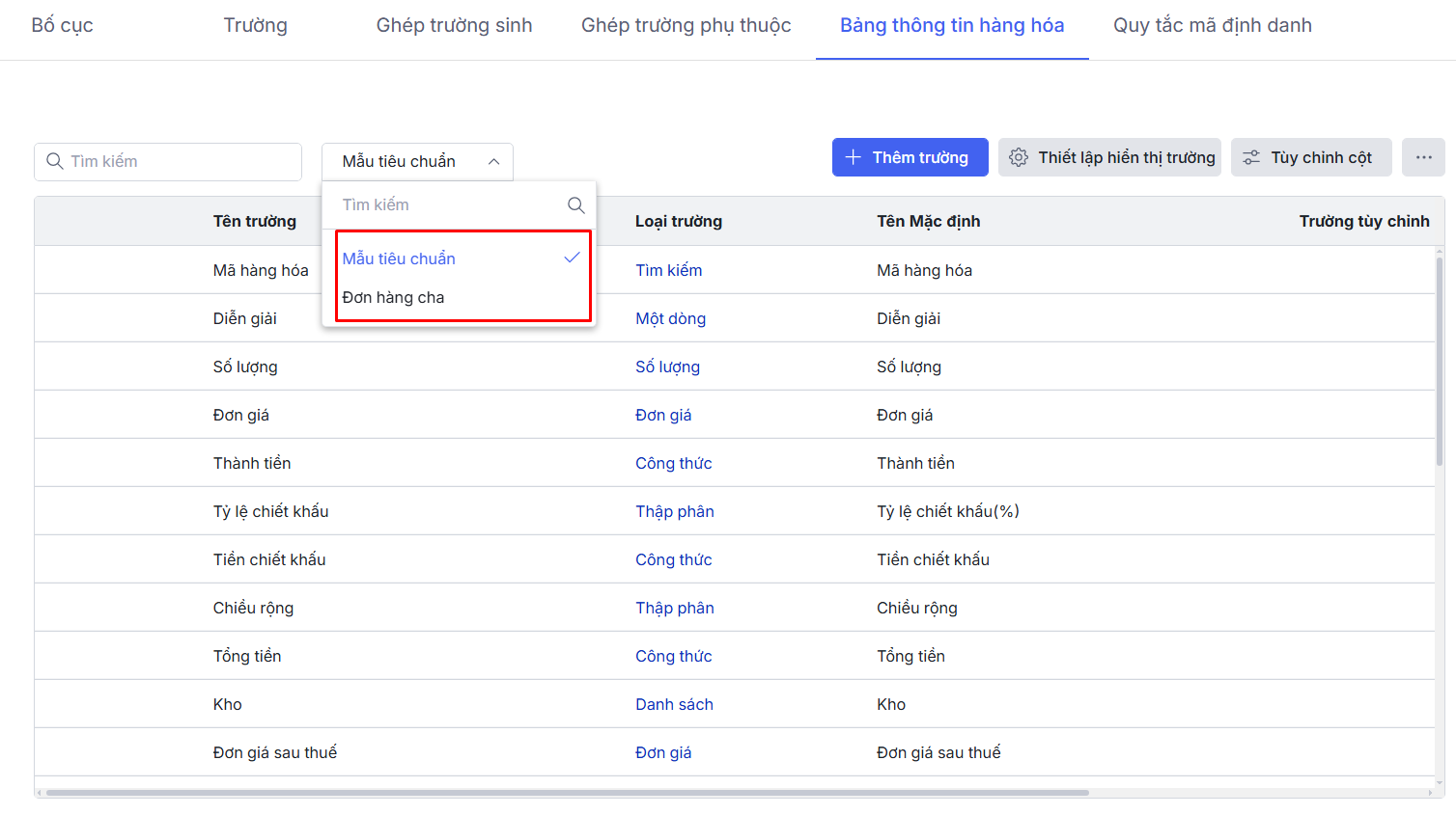 - Khi Chọn hàng hóa từ đơn hàng cha/báo giá, trường thông tin nào thiết lập không hiển thị sẽ không lấy được dữ liệu sang và không tự động tính được các thông tin còn lại tương ứng.
