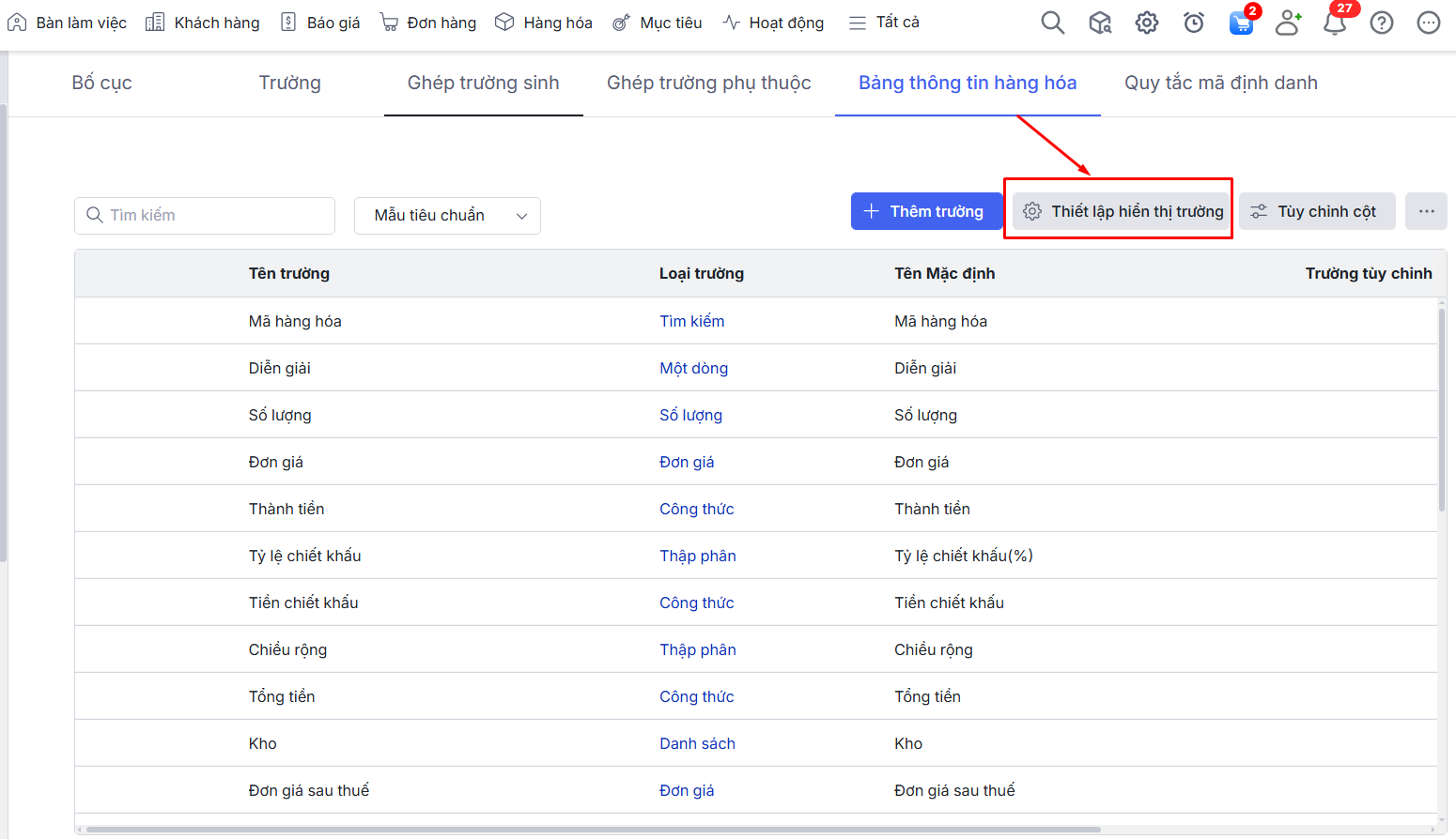 để hiển thị Thiết lập\ Vào Tùy chỉnh\ Phân hệ và trường.