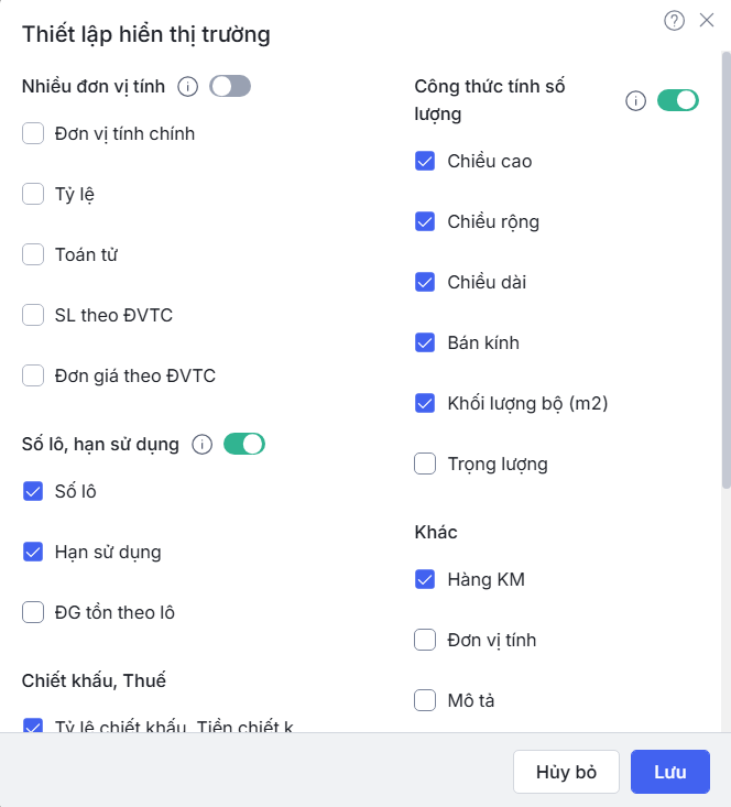 Bước 6: Lựa chọn Bật/Tắt các mục theo nhu cầu\ Tích chọn các trường thông tin muốn hiển thị. Xem hướng dẫn chi tiết về các mục tại đây.