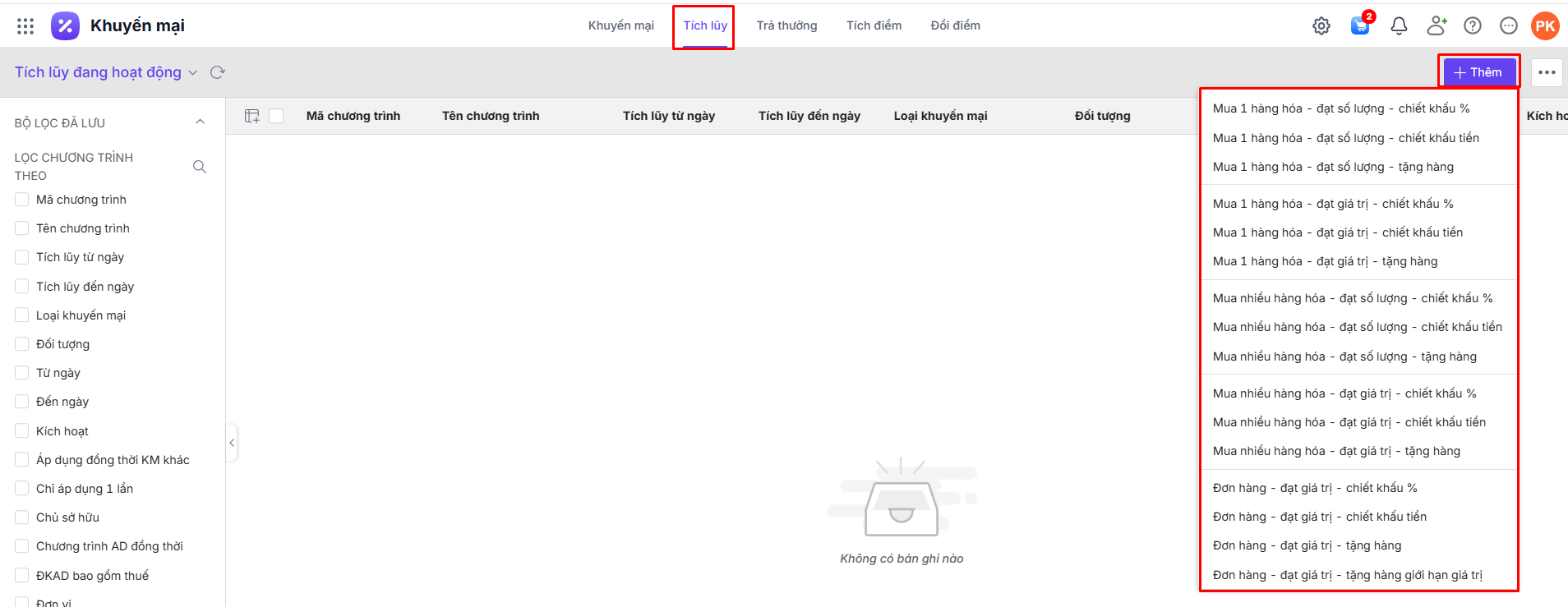 Bước 1: Trên AMIS Khuyến mại, tại tab Tích lũy, nhấn Thêm và chọn 1 trong các loại tích lũy.