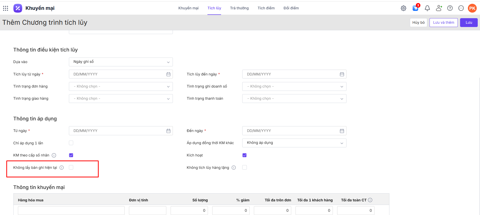 Khi áp dụng chương trình tích lũy, nếu có tích chọn Không lấy bản ghi hiện tại thì hệ thống chỉ xét giá trị từ các đơn hàng đã tích lũy của khách hàng, không tính thêm số lượng/giá trị của bản ghi đang thao tác.