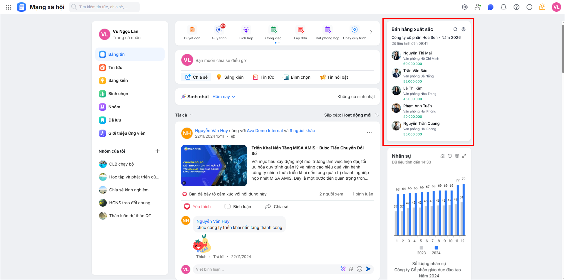 Bước 1: Trên trang chủ ứng dụng Mạng xã hội, báo cáo Bán hàng xuất sắc hiển thị ở bên phải giao diện.