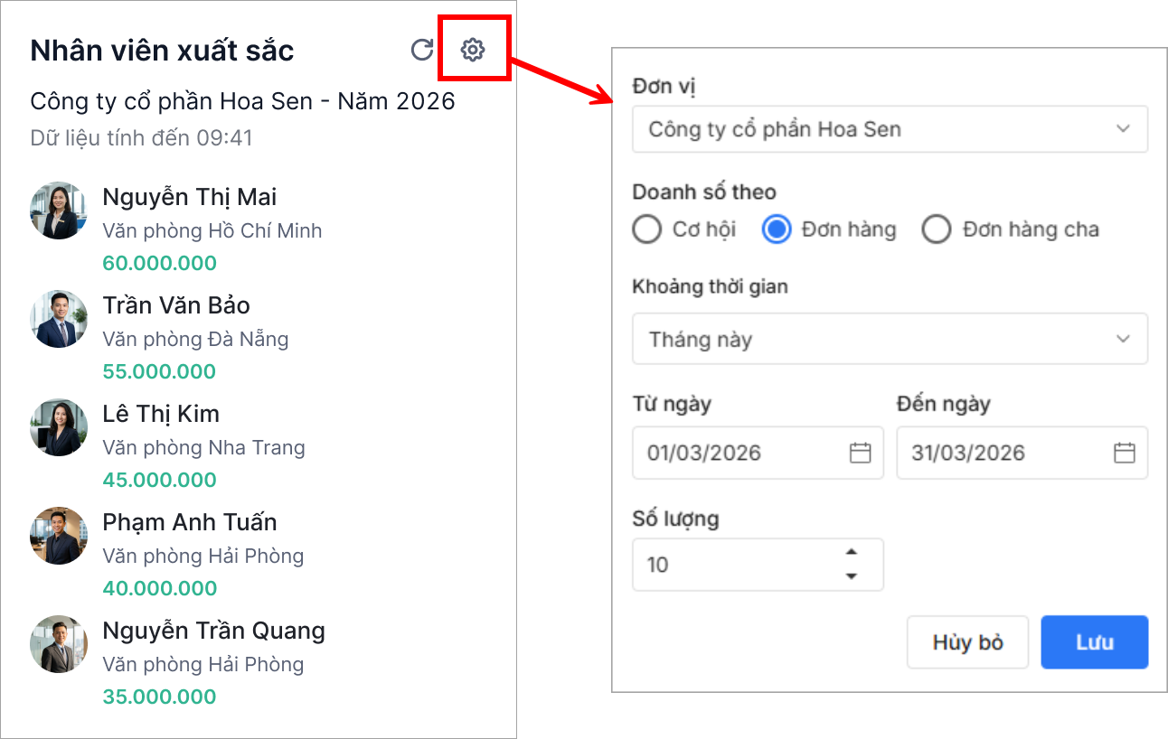 • Số lượng nhân viên hiển thị trên báo cáo được lấy theo tham số Số lượng hiển thị.