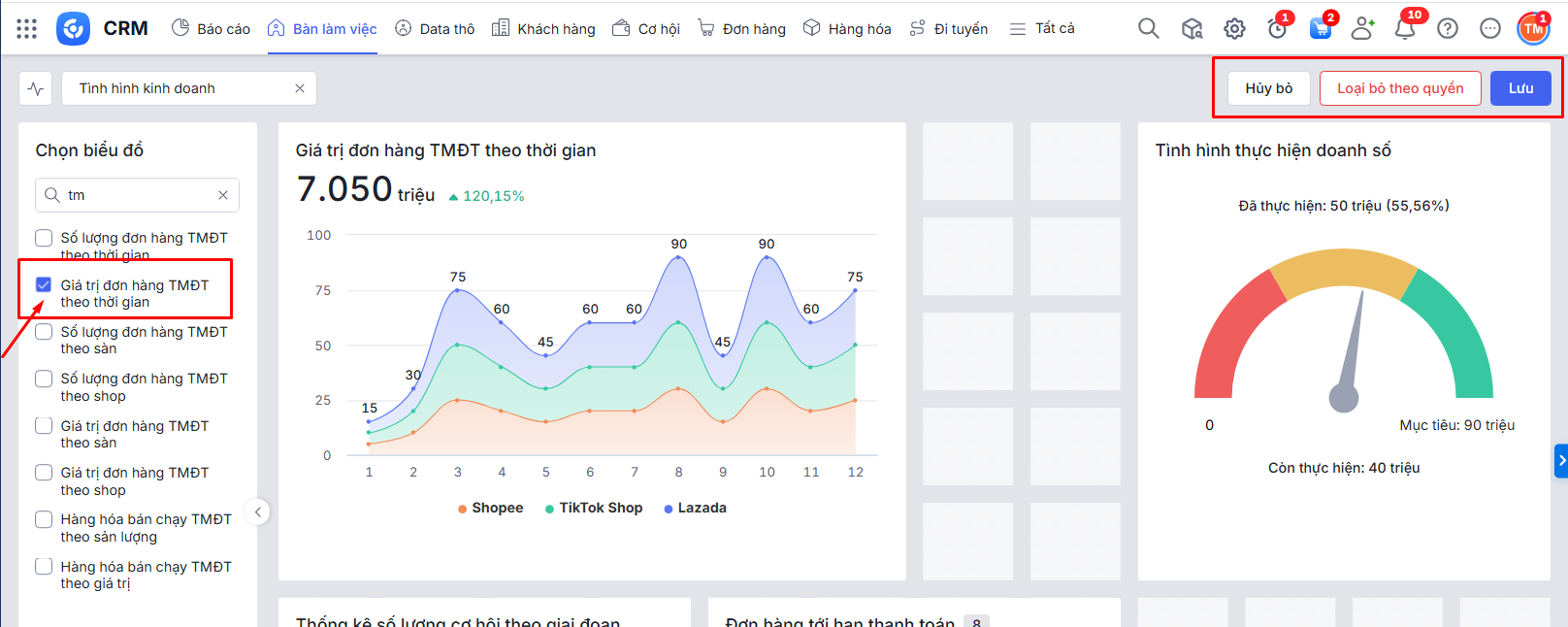 Tổng giá trị đơn hàng TMĐT (hiển thị ở trên cùng của biểu đồ): là tổng Giá trị đơn hàng của các Đơn hàng có thông tin ở trường Sàn thương mại điện tử và thỏa mãn điều kiện: