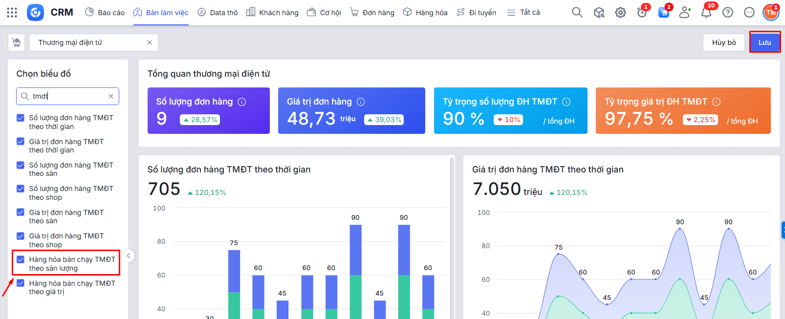 Bước 2: Tìm kiếm Báo cáo Hàng hóa bán chạy TMĐT theo sản lượng\Nếu chưa tích chọn để hiển thị trên Bàn làm việc\Tích chọn hiển thị\Nhấn Lưu.