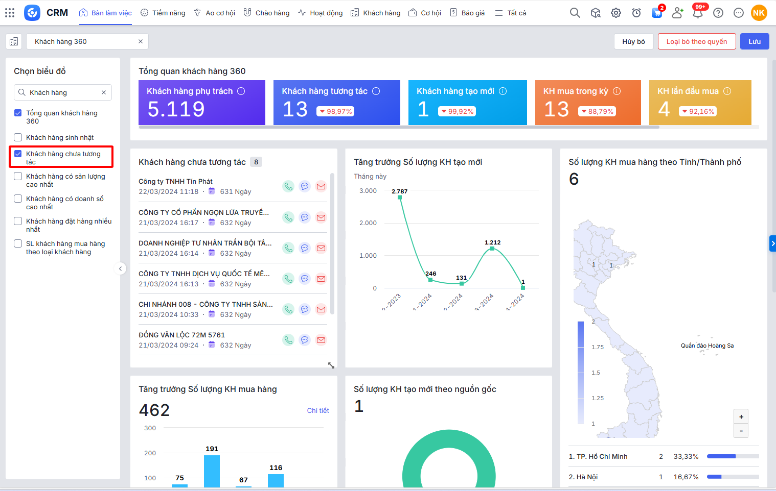 Bước 2: Tại ô tìm kiếm nhập Khách hàng chưa tương tác\chọn vào báo cáo Khách hàng chưa tương tác\nhấn Lưu