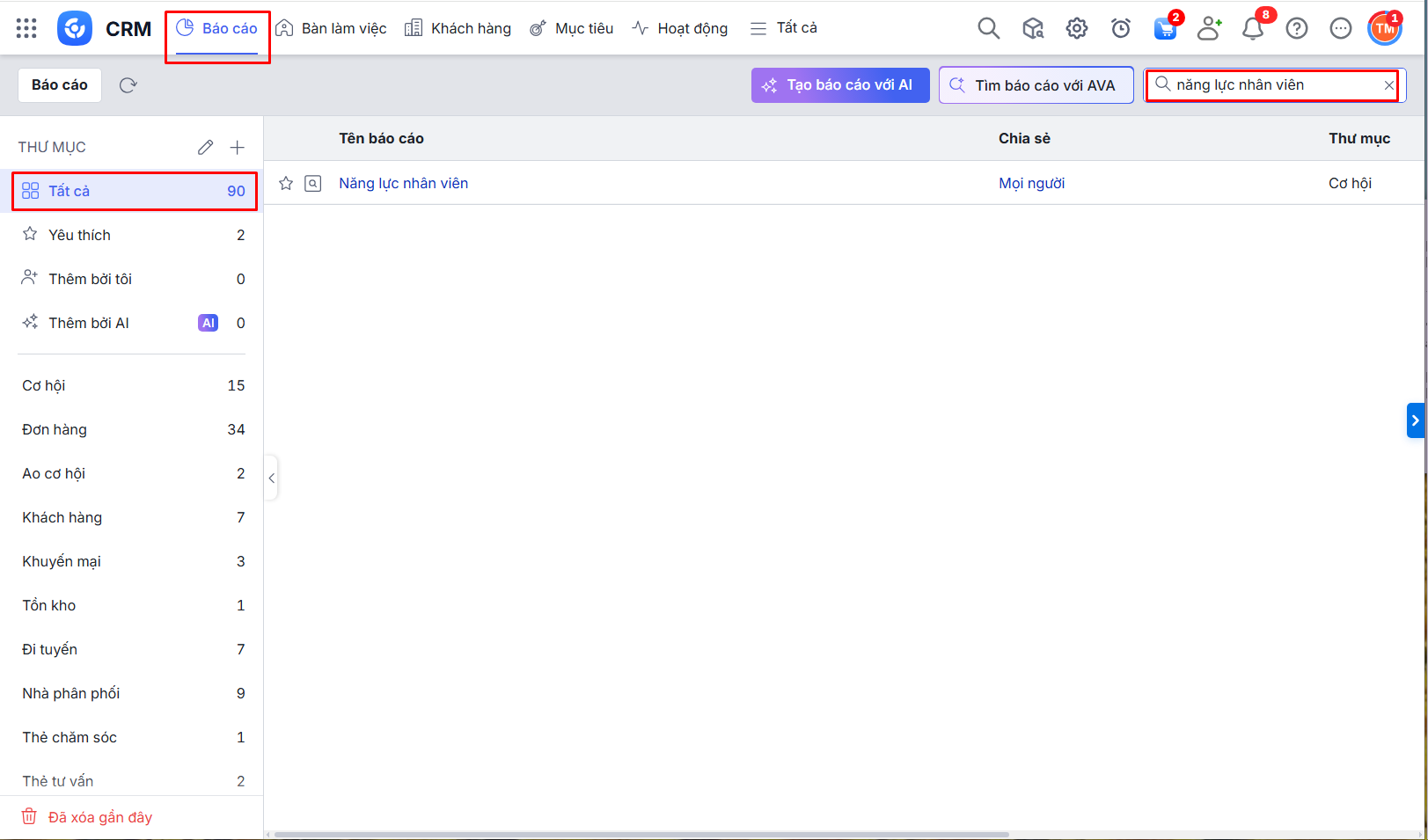 Bước 1: Vào phân hệ Báo cáo\Tất cả báo cáo\Tìm kiếm Năng lực nhân viên tại ô tìm kiếm.