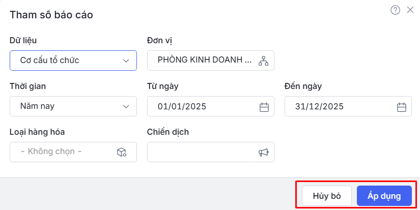 Bước 2: Nhấn đúp chuột để mở báo cáo\Chọn tham số báo cáo theo đơn vị, nhân viên, thời gian, loại hàng hóa,… cần xem\Nhấn Áp dụng.