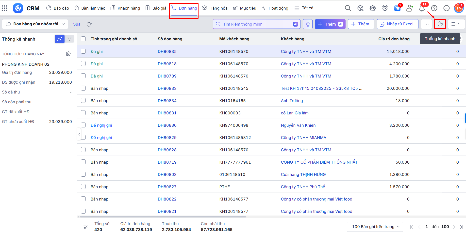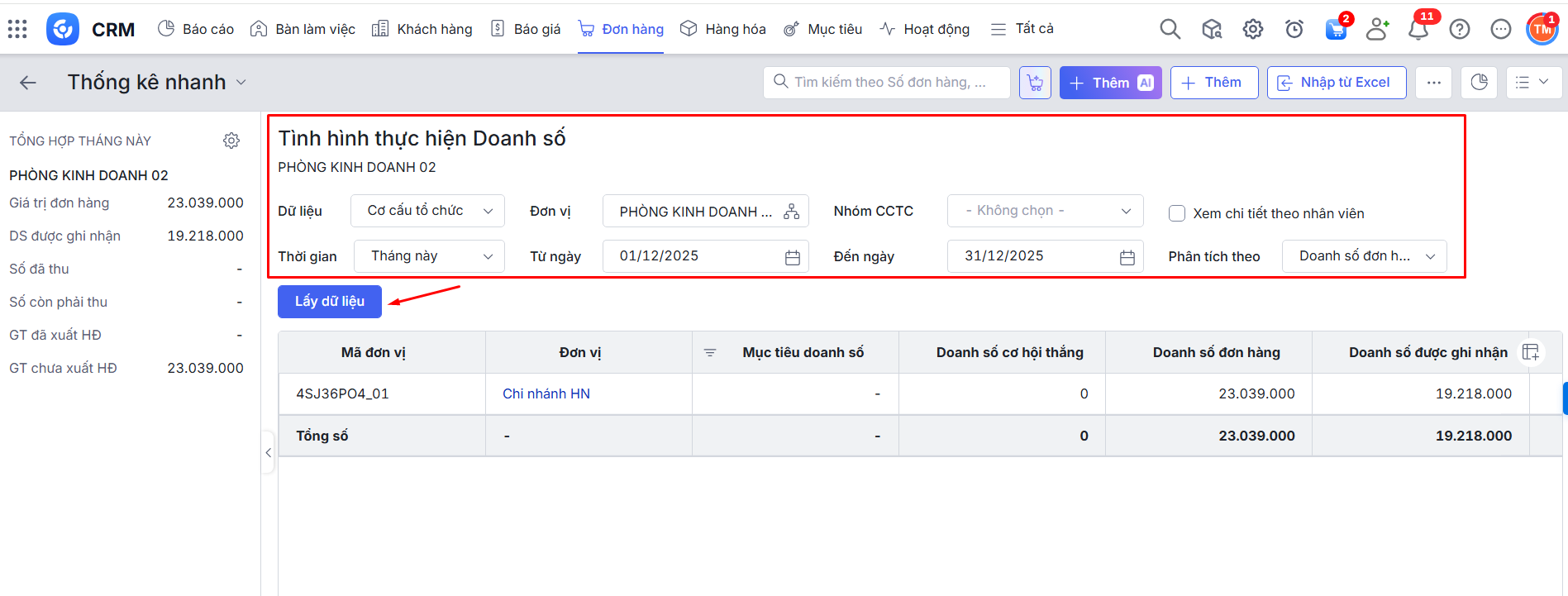 - Cách xem báo cáo nhanh tình hình thực hiện doanh số từ danh sách Đơn hàng.