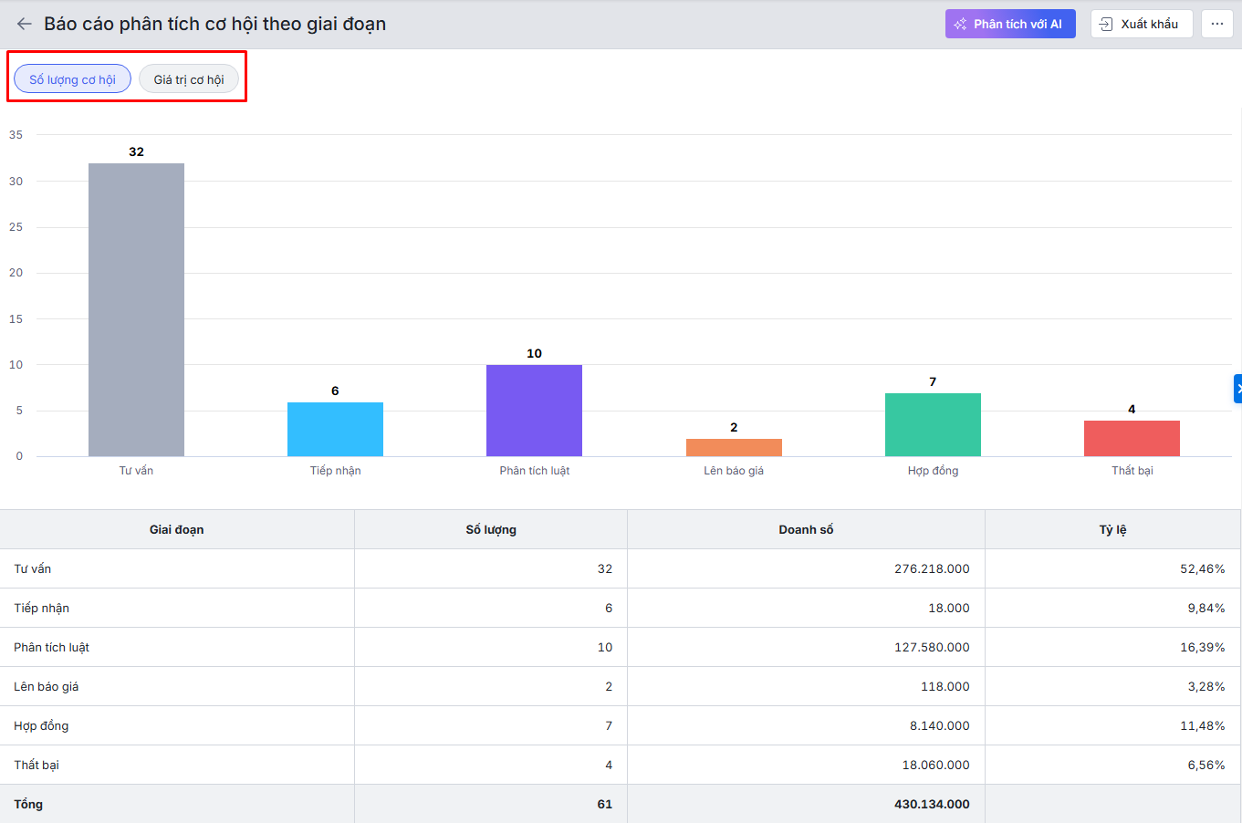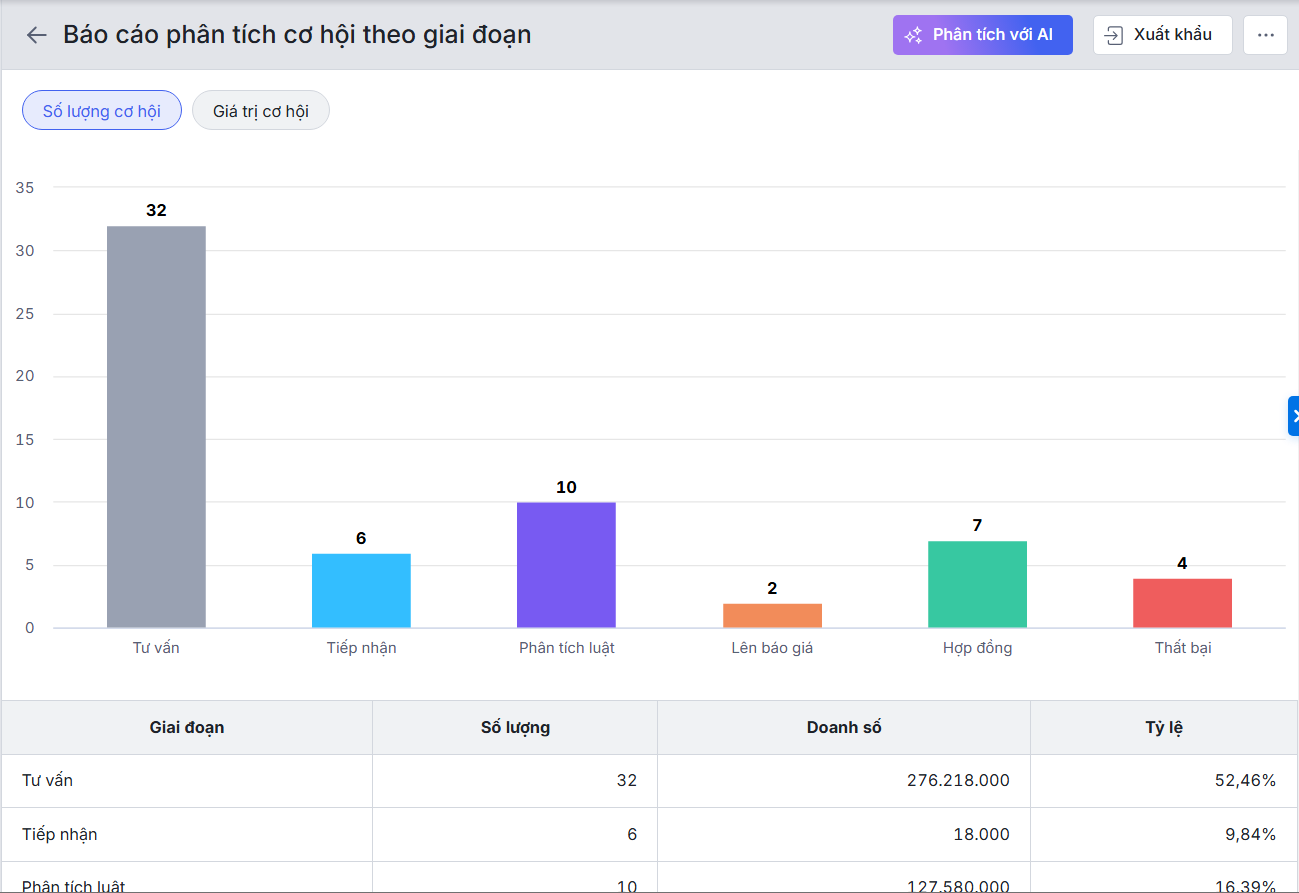 Bài viết hướng dẫn cách xem và lấy số liệu trên báo cáo Phân tích cơ hội theo giai đoạn trên AMIS CRM. Báo cáo giúp theo dõi số lượng và doanh số cơ hội tại từng giai đoạn trong quy trình bán hàng. Qua đó, nắm được tình hình chăm sóc, tiến độ xử lý cơ hội và đưa ra các quyết sách để nâng cao hiệu quả bán hàng.