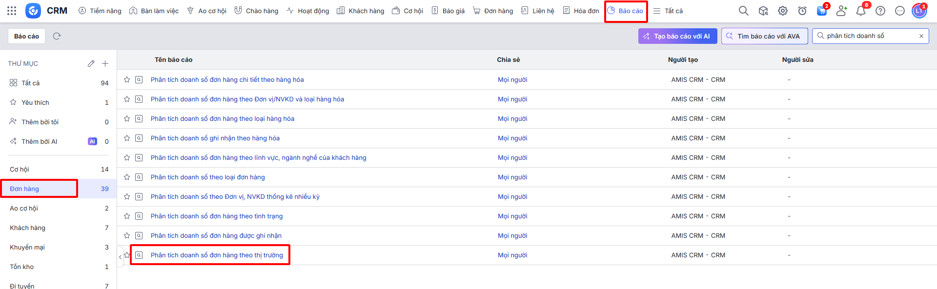 Bước 1: Đăng nhập vào AMIS CRM, vào phân hệ Báo cáo \ thư mục Đơn hàng \ Phân tích doanh số đơn hàng theo thị trường.