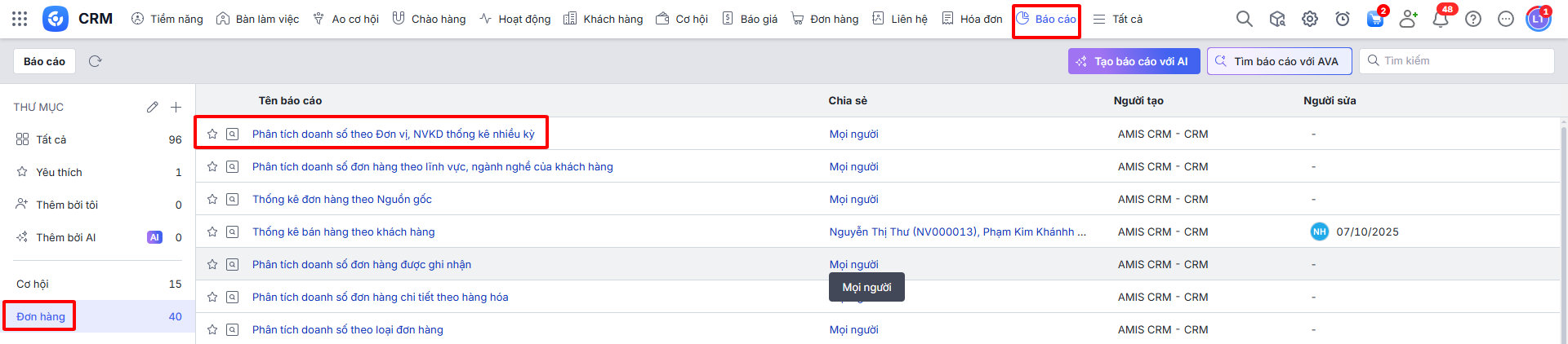 Bước 1: Đăng nhập vào AMIS CRM, vào phân hệ Báo cáo \ thư mục Đơn hàng \ Phân tích doanh số theo Đơn vị, NVKD thống kê nhiều kỳ.