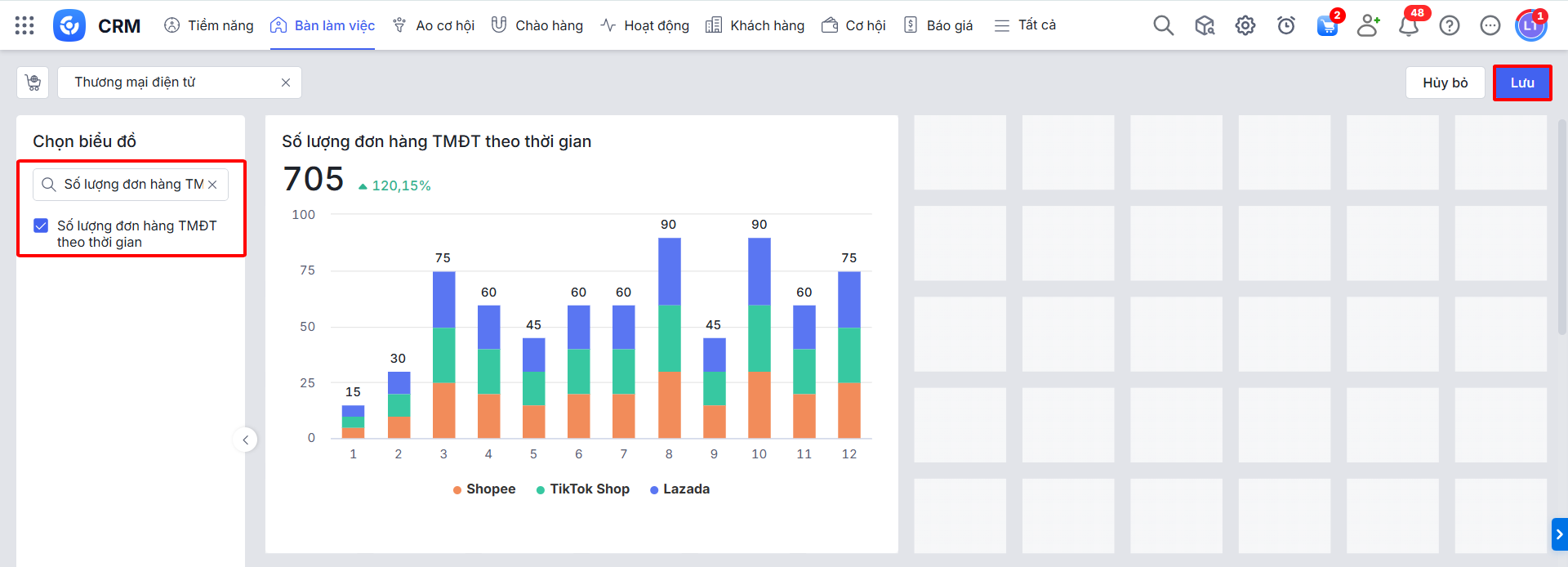 - Tổng số lượng đơn hàng TMĐT (hiển thị ở trên cùng của biểu đồ): là tổng số lượng Đơn hàng của các Đơn hàng có thông tin ở trường Sàn thương mại điện tử và thỏa mãn điều kiện: