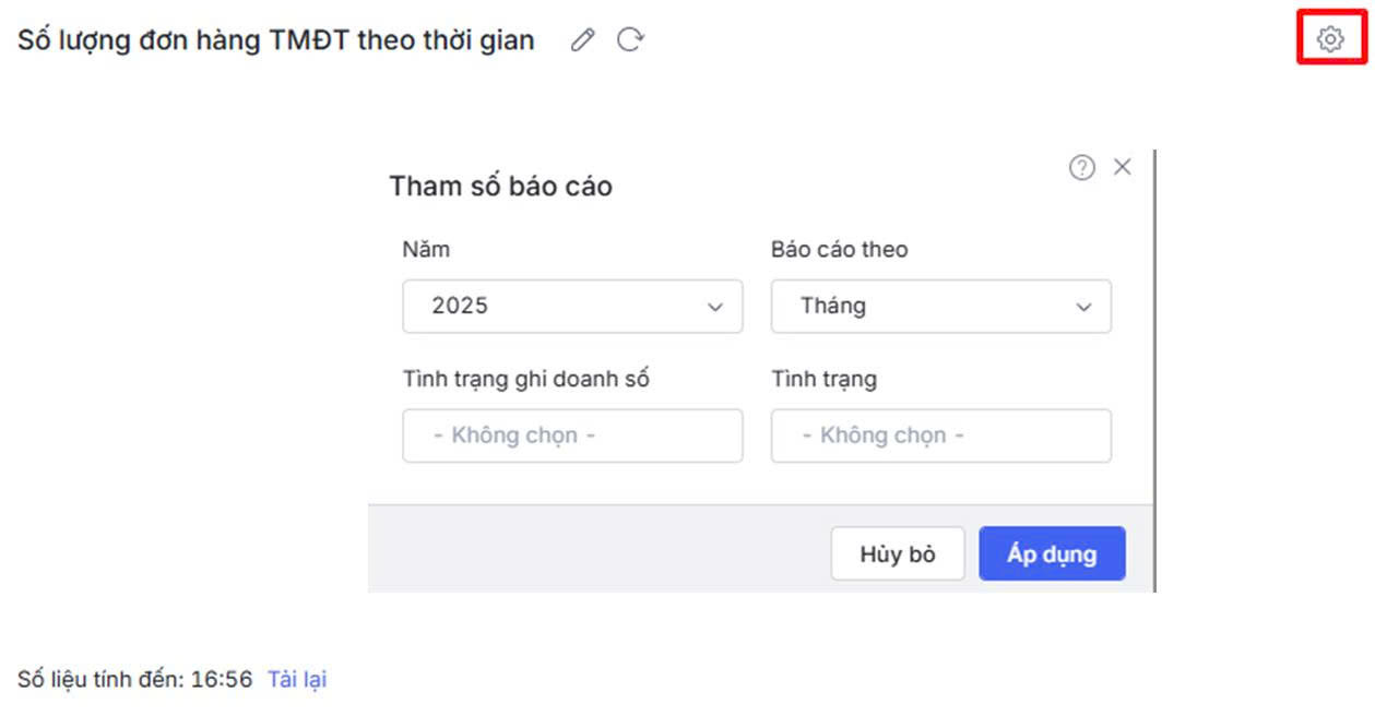 Bước 3: Tại báo cáo Số lượng đơn hàng TMĐT theo thời gian, nhấn biểu tượng bánh răng để chọn tham số báo cáo cần xem.