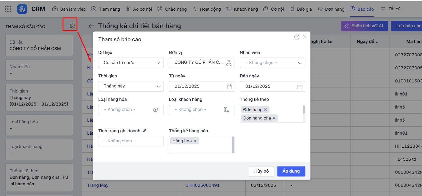 Bước 2: Nhấn biểu tượng bánh răng > Thiết lập tham số báo cáo > nhấn Áp dụng.