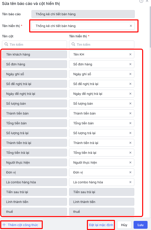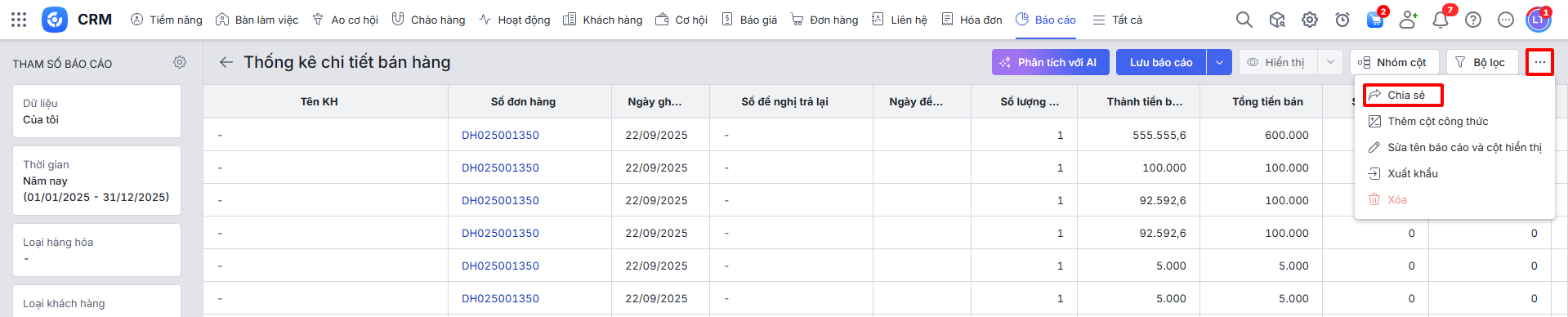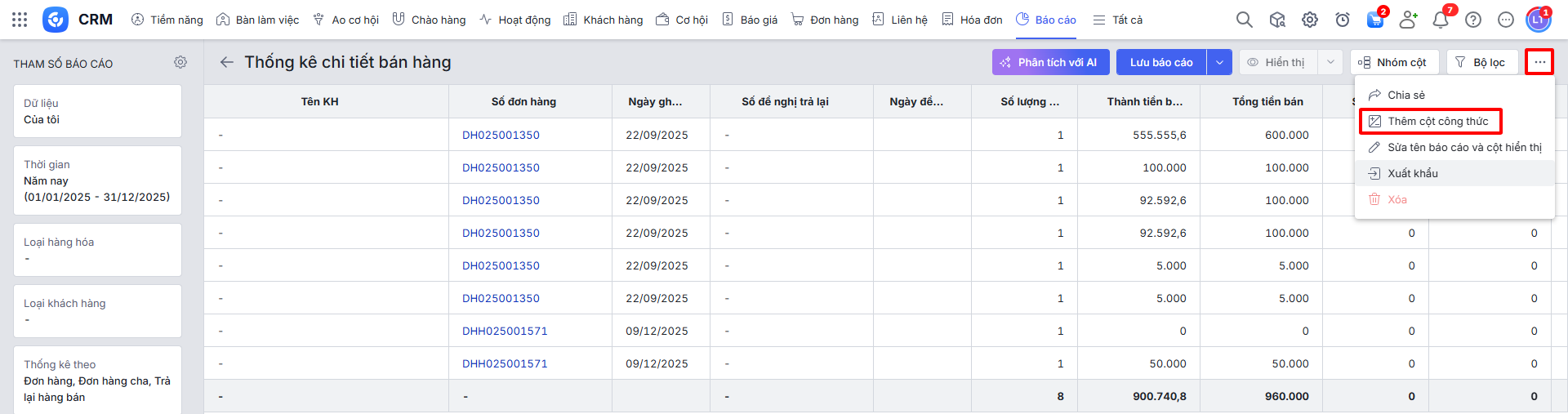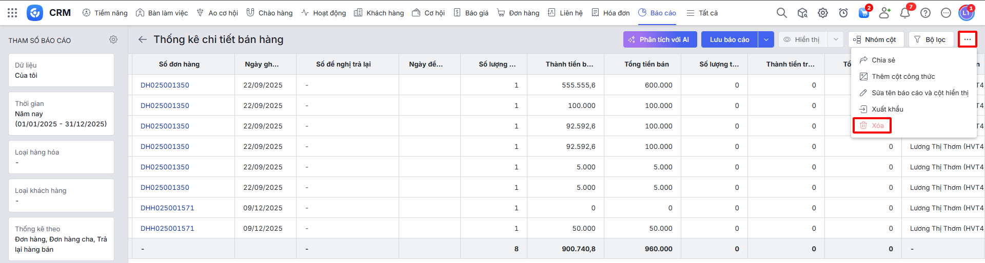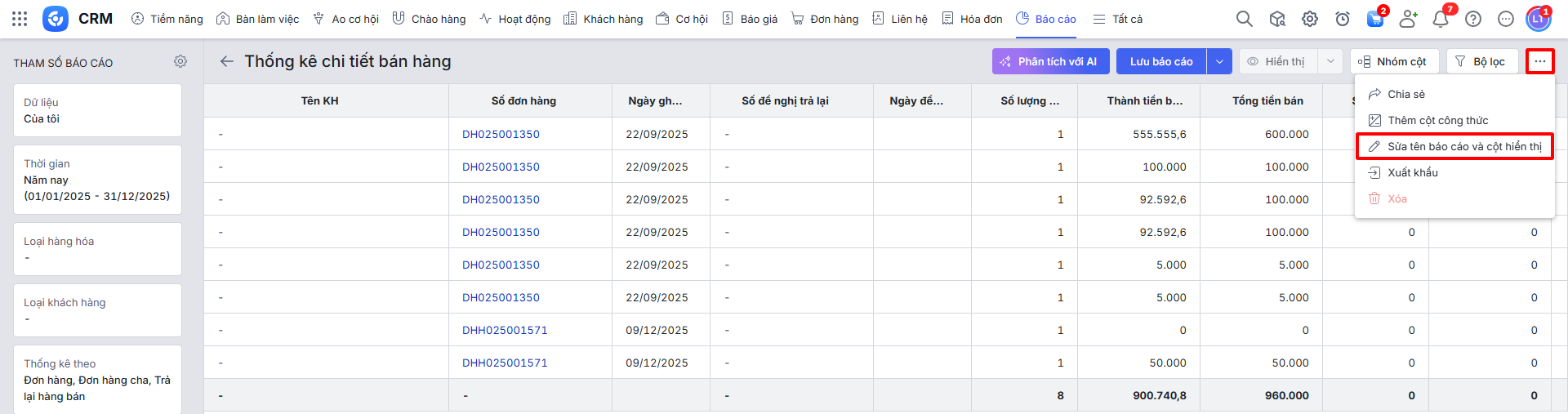 Từ báo cáo Thống kê chi tiết bán hàng có sẵn, người dùng có thể tùy chỉnh để tạo báo cáo mới phù hợp với nhu cầu doanh nghiệp bằng cách lọc dữ liệu, nhóm cột, v.v.