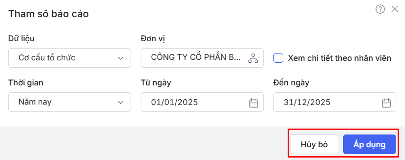 Trường hợp 2: Xem báo cáo chi tiết theo Nhân viên (Tham số chọn Đơn vị là cơ cấu tổ chức cấp thấp nhất hoặc chọn Xem chi tiết theo Nhân viên)