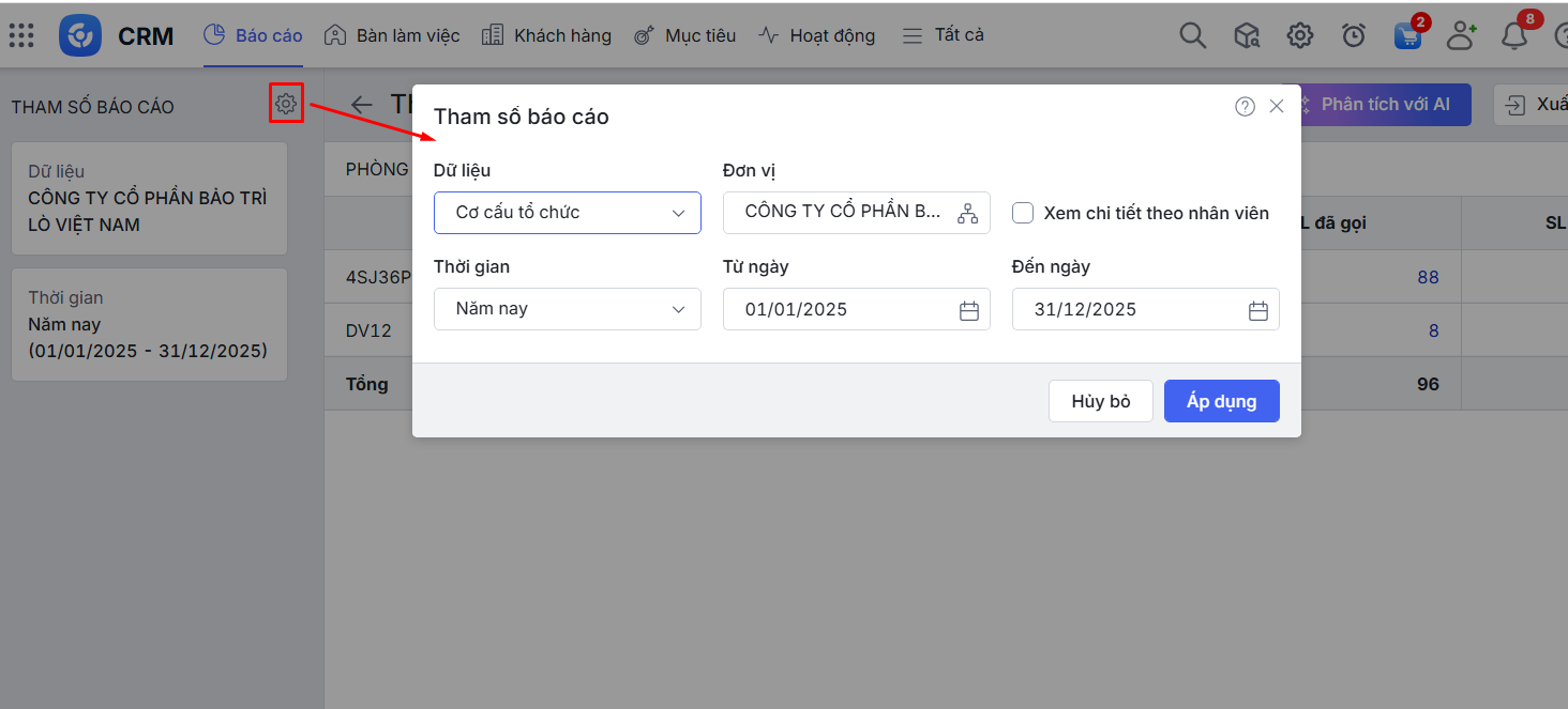 Bước 2: Nhấn đúp chuột để mở báo cáo\Chọn tham số báo cáo theo đơn vị, nhân viên, thời gian,… cần xem\Nhấn Áp dụng.