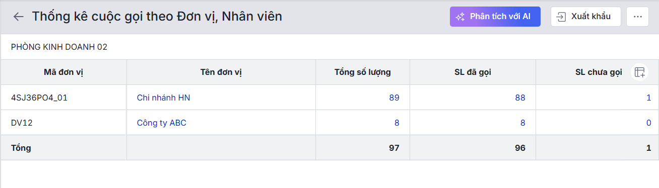 2.1. Cách xem báo cáo Thống kê cuộc gọi theo Đơn vị, Nhân viên