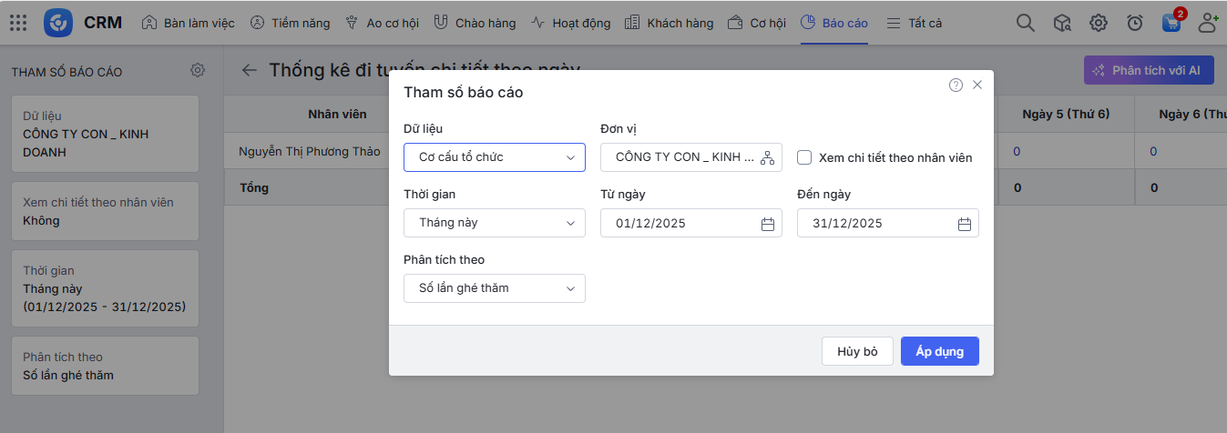 Bài viết hướng dẫn cách xem và phân tích “Báo cáo Thống kê đi tuyến theo ngày” trên AMIS CRM. Báo cáo này trình bày các chỉ số hoạt động đi tuyến quan trọng được thống kê theo từng ngày cụ thể trong một khoảng thời gian, giúp nhà quản lý dễ dàng so sánh hiệu suất làm việc giữa các ngày, theo dõi tiến độ và nhanh chóng phát hiện các điểm bất thường trong hoạt động hàng ngày của đội ngũ thị trường.