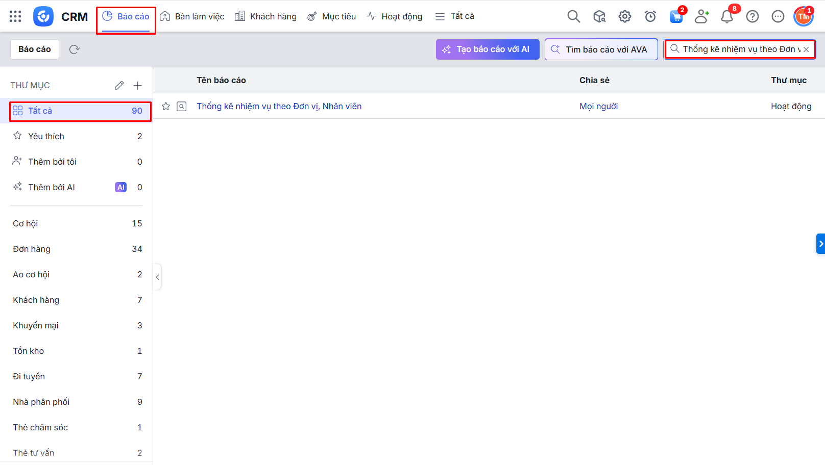 Bước 1: Vào phân hệ Báo cáo\Tất cả báo cáo\Tìm kiếm Thống kê nhiệm vụ theo Đơn vị, Nhân viên tại ô tìm kiếm.