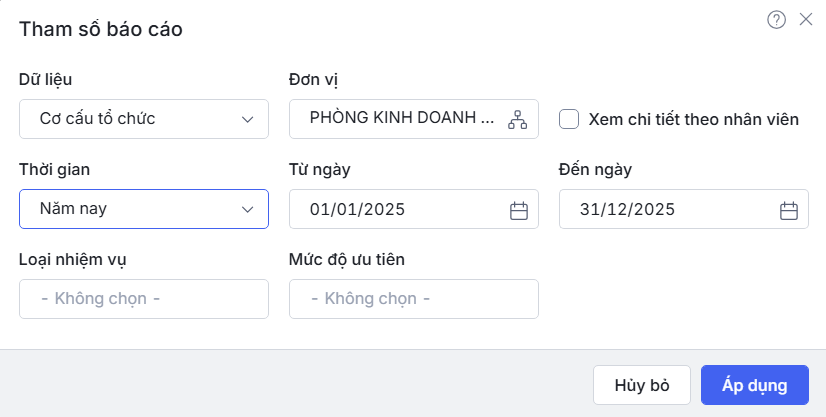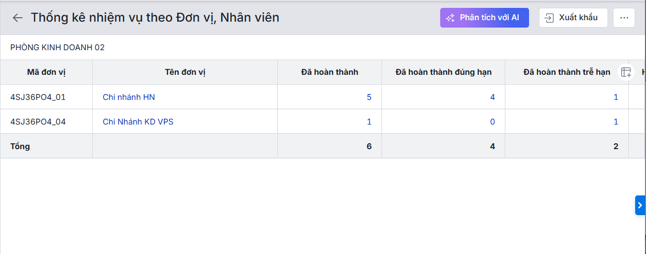 2.1. Cách xem báo cáo Thống kê nhiệm vụ theo Đơn vị, Nhân viên