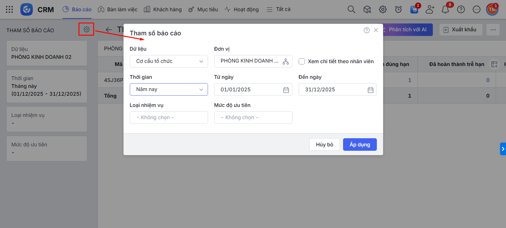 Bước 2: Nhấn đúp chuột để mở báo cáo\Chọn tham số báo cáo theo đơn vị, nhân viên, thời gian,… cần xem\Nhấn Áp dụng.