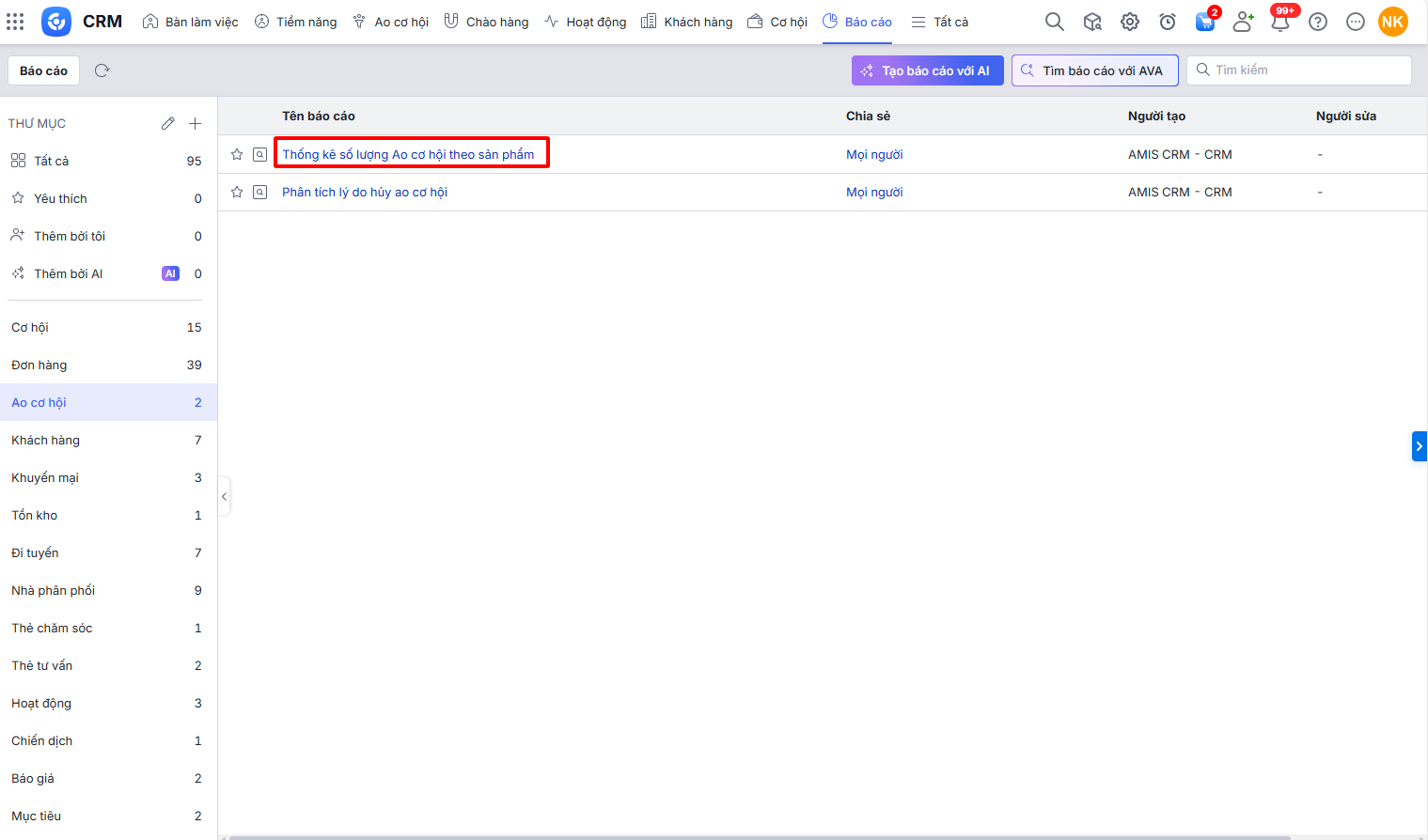 Bước 1: Trên AMIS CRM, vào phân hệ Báo cáo\thư mục Cơ hội\Báo cáo Thống kê số lượng Ao cơ hội theo sản phẩm.