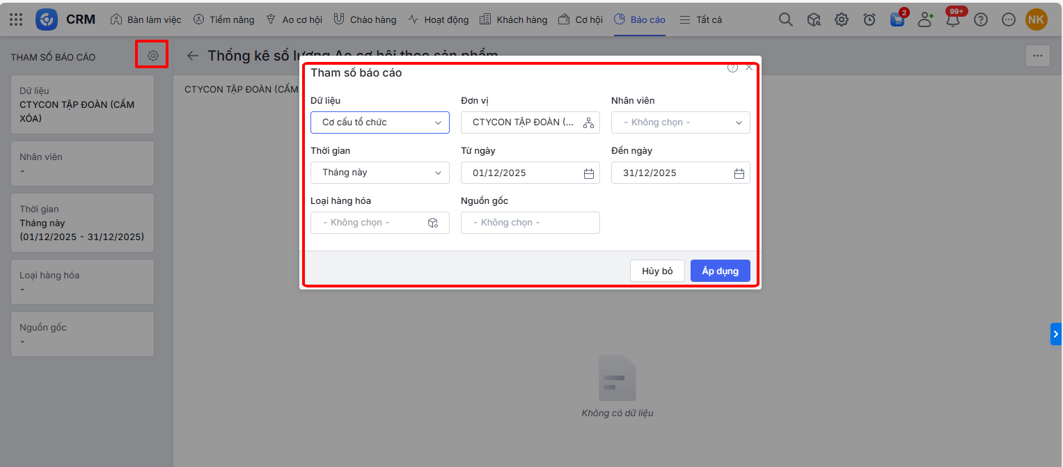 Bước 2: Chọn tham số báo cáo theo đơn vị, thời gian… cần xem, nhấn Áp dụng.