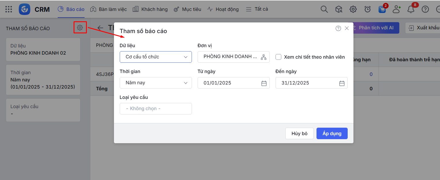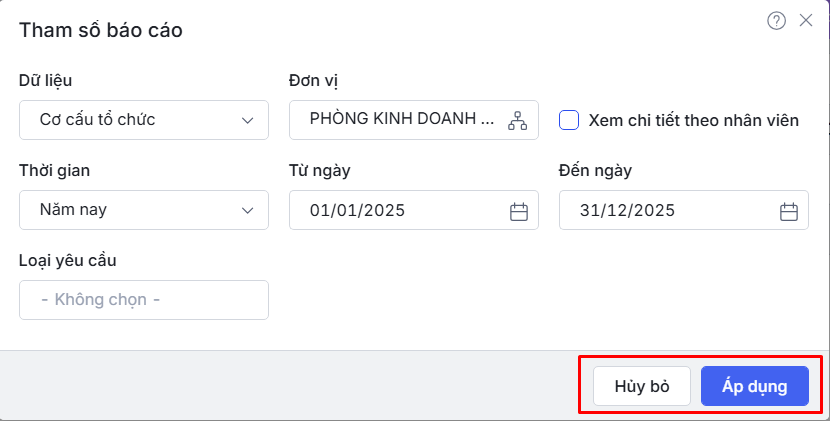 Bước 2: Nhấn đúp chuột để mở báo cáo\Chọn tham số báo cáo theo đơn vị, nhân viên, thời gian,… cần xem\Nhấn Áp dụng.