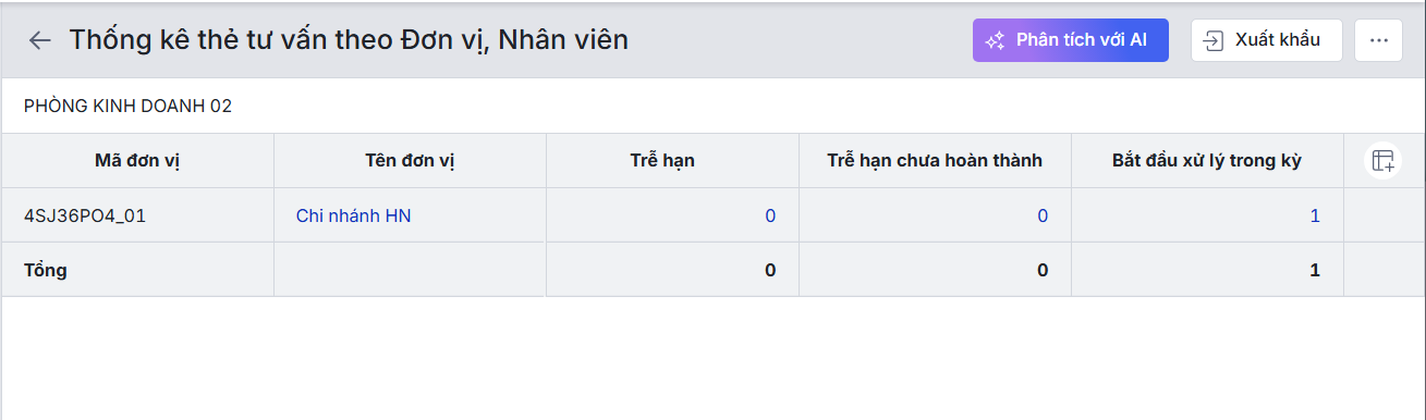2.1. Cách xem báo cáo Thống kê thẻ tư vấn theo Đơn vị, Nhân viên