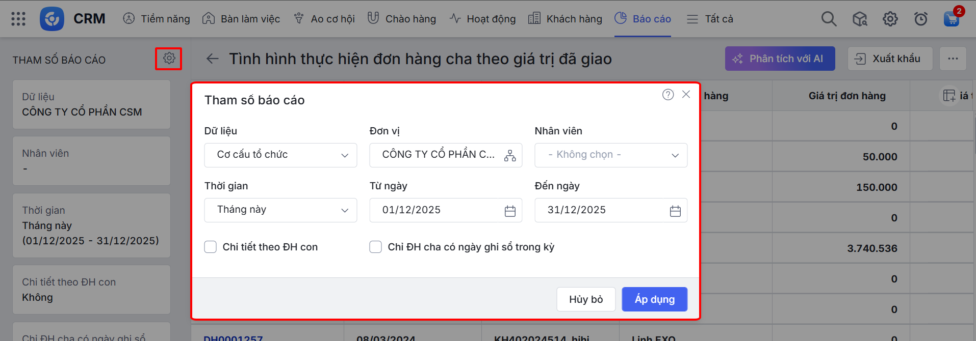 2.1. Hướng dẫn cách xem báo cáo Tình hình thực hiện đơn hàng cha theo giá trị đã giao