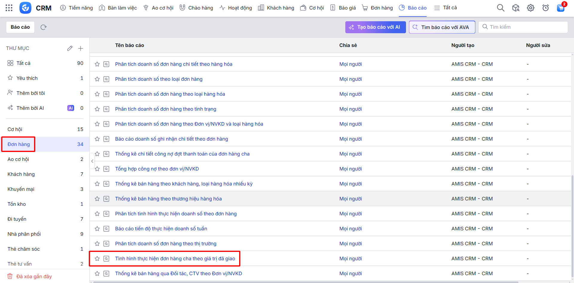 Bước 1: Trên AMIS CRM, vào phân hệ Báo cáo \ thư mục Đơn hàng \ Tình hình thực hiện đơn hàng cha theo giá trị đã giao.