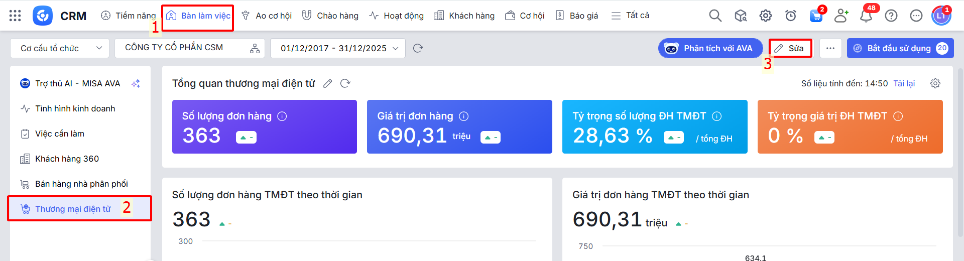 Bước 1: Trên AMIS CRM, vào phân hệ Bàn làm việc \ chọn mục Thương mại điện tử \ nhấn Sửa