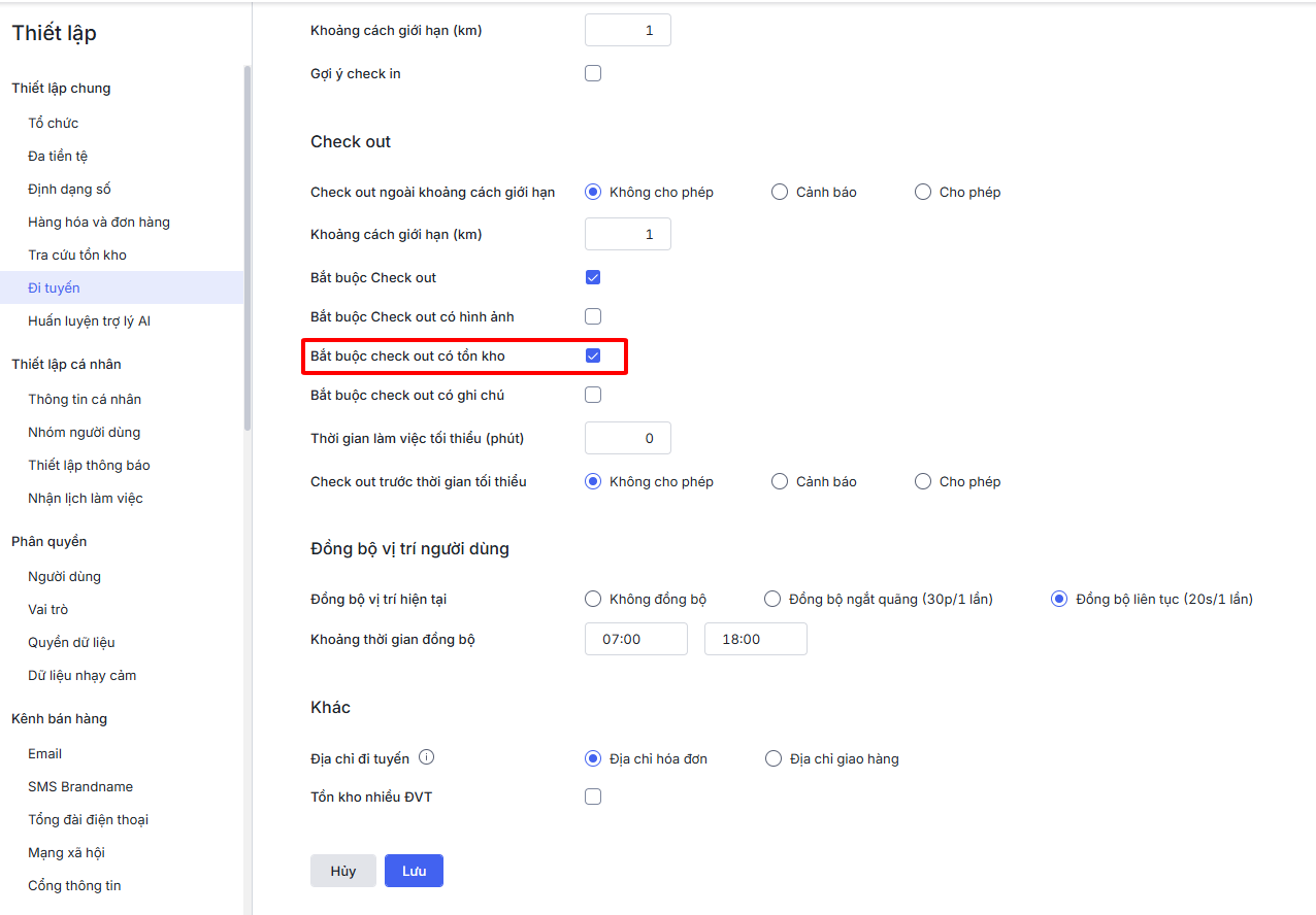 Bài viết hướng dẫn cách thiết lập quy tắc “Bắt buộc check out có tồn kho” trong nghiệp vụ Đi tuyến trên AMIS CRM. Việc bật thiết lập này sẽ yêu cầu nhân viên kinh doanh phải ghi nhận thông tin tồn kho tại điểm bán của khách hàng trước khi có thể check-out kết thúc một lượt ghé thăm. Điều này giúp đảm bảo tính tuân thủ, nâng cao chất lượng dữ liệu thu thập từ thị trường và cung cấp cho nhà quản lý thông tin chính xác về tình hình hàng hóa tại các điểm bán.