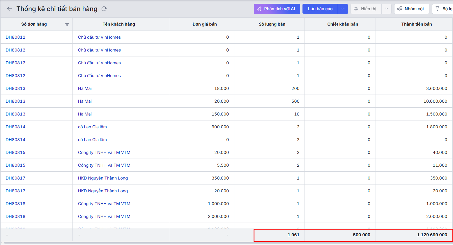 Ở báo cáo Thống kê chi tiết bán hàng, Thống kê chi tiết công nợ theo Đơn hàng: