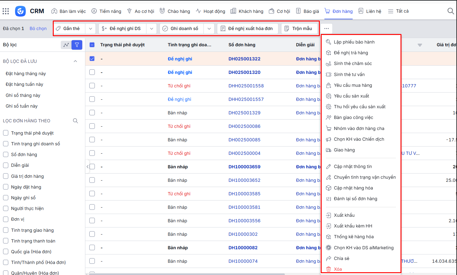 - Đề nghị ghi DS: Đề nghị ghi nhận doanh số cho các đơn hàng.
