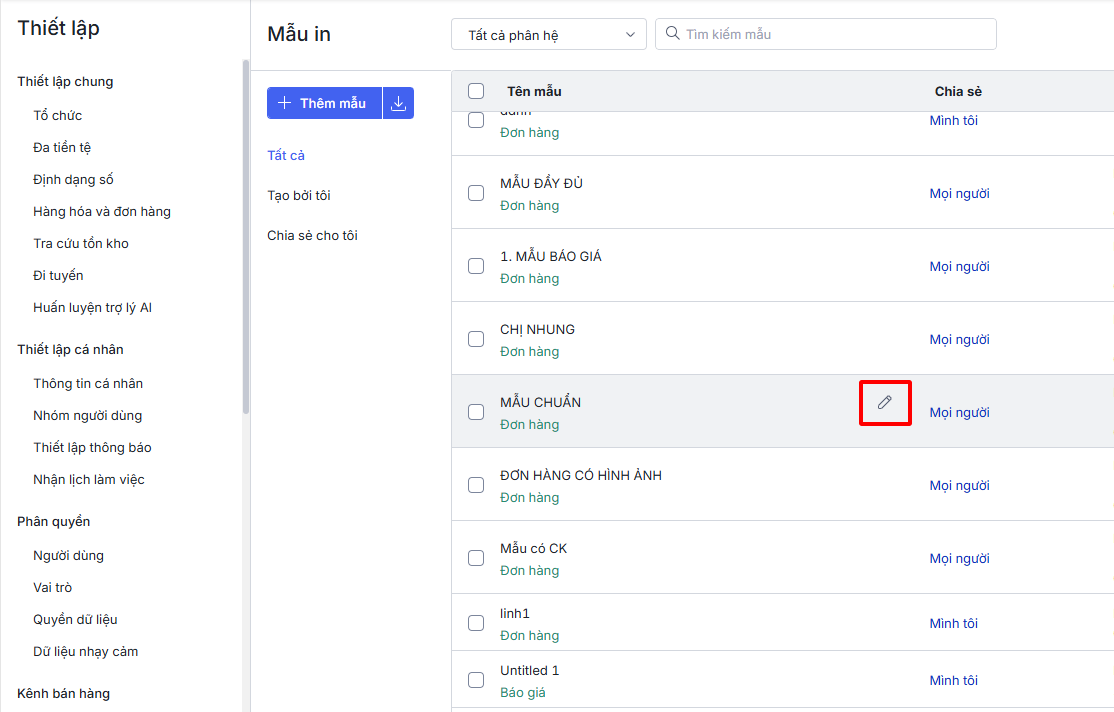 Bước 2: Tại màn hình danh sách mẫu trộn, di chuột đến dòng chứa mẫu muốn sửa và nhấn biểu tượng cây bút