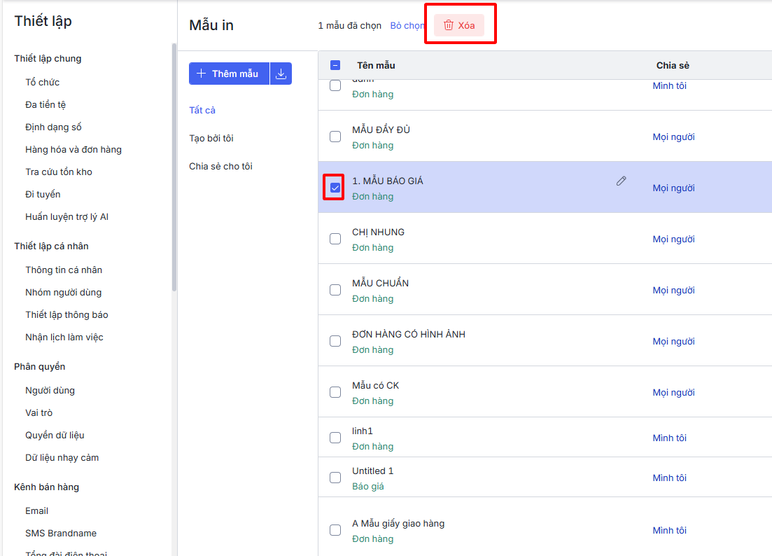 Bước 3: Tại màn hình danh sách mẫu trộn, tích chọn các mẫu muốn sửa và chọn Xóa.