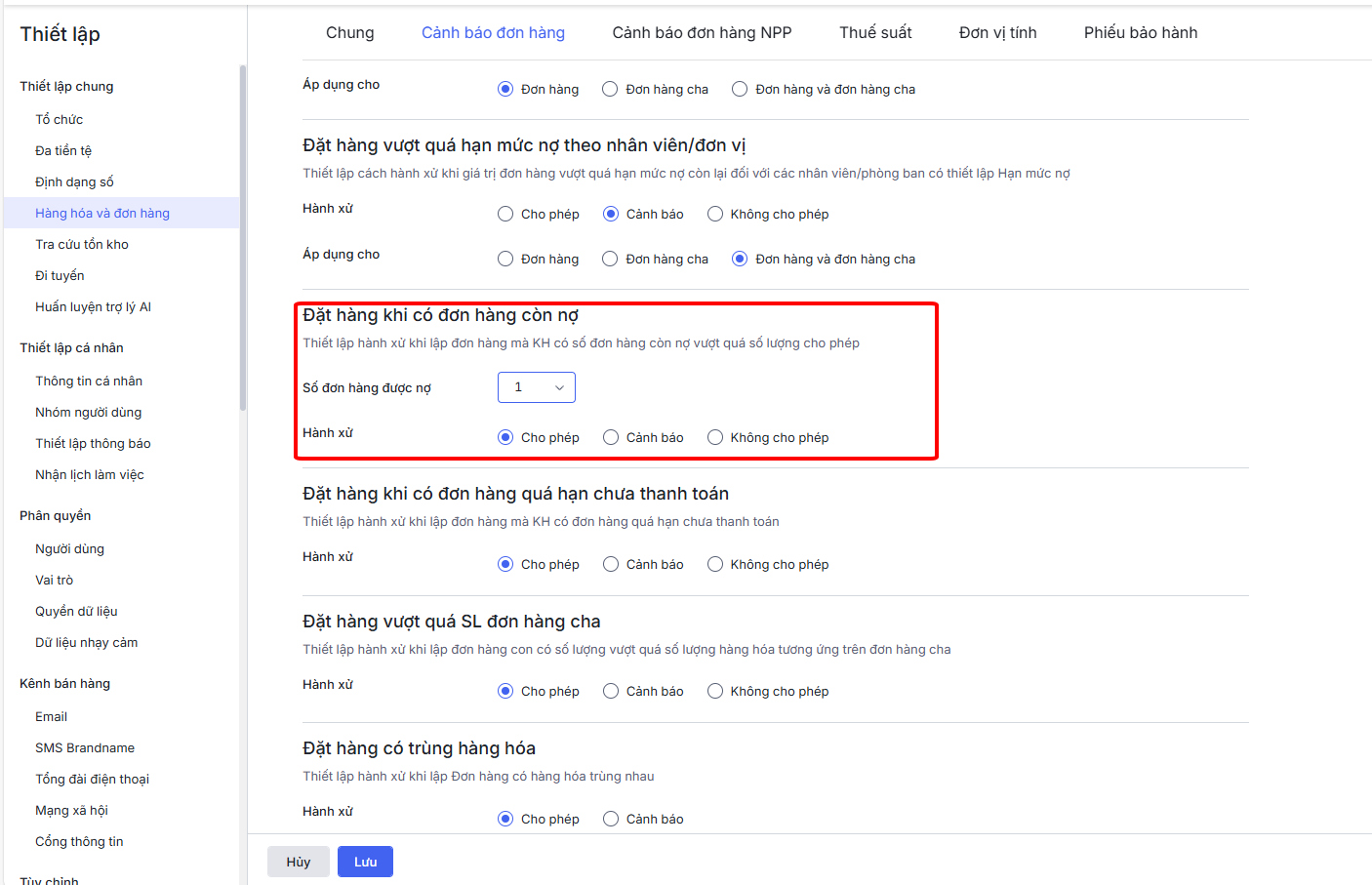 Bước 3: Tại mục Đặt hàng khi có đơn hàng còn nợ, chọn Số lượng đơn hàng được nợ (từ 1->5 đơn hàng)