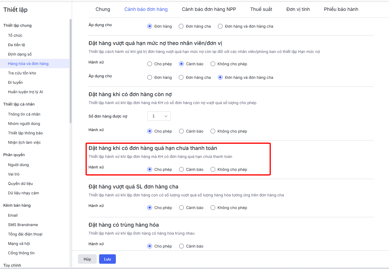 Bước 3: Tại mục Đặt hàng khi có đơn hàng quá hạn chưa thanh toán, chọn hành xử của hệ thống khi lập đơn hàng mà khách hàng có đơn hàng quá hạn chưa thanh toán.
