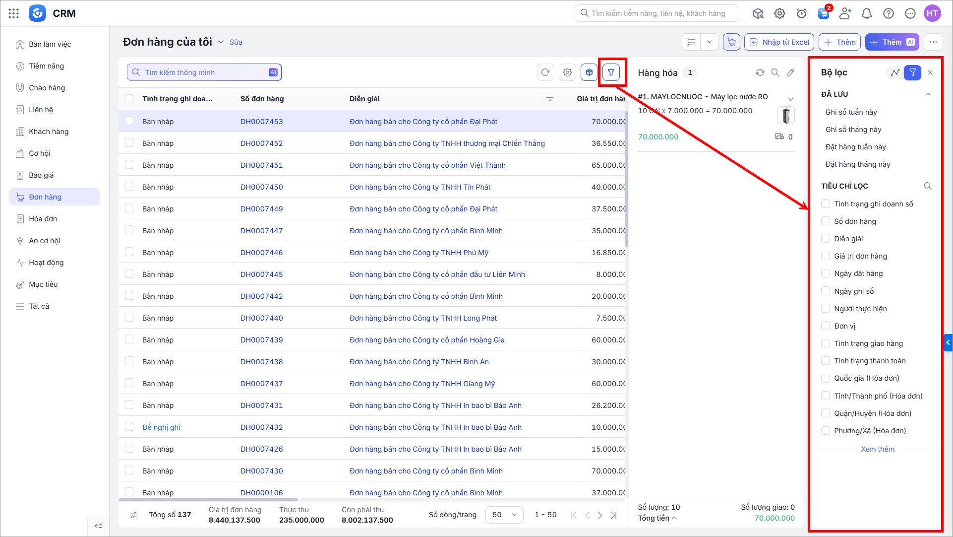 - Ở từng phân hệ, bộ lọc chuyển sang phía bên phải màn hình.