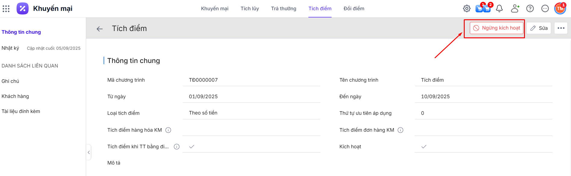 Tại chi tiết Chương trình tích điểm đã kích hoạt\ Nhấn Ngừng kích hoạt.