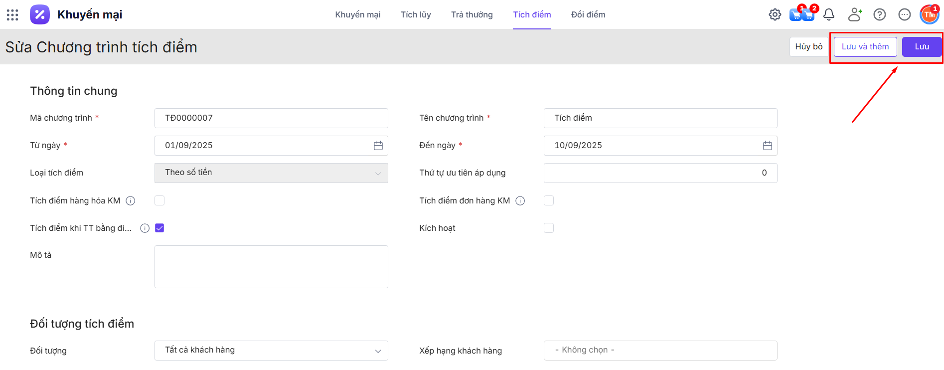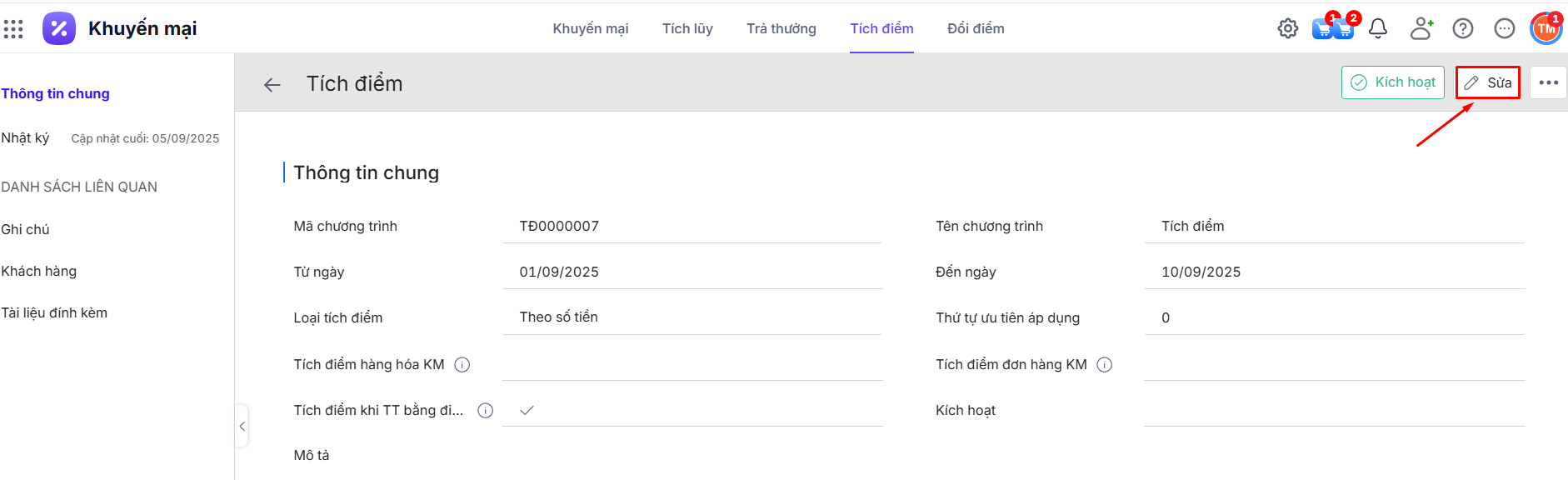 Bước 1: Tại chi tiết chương trình tích điểm\ Nhấn Sửa.