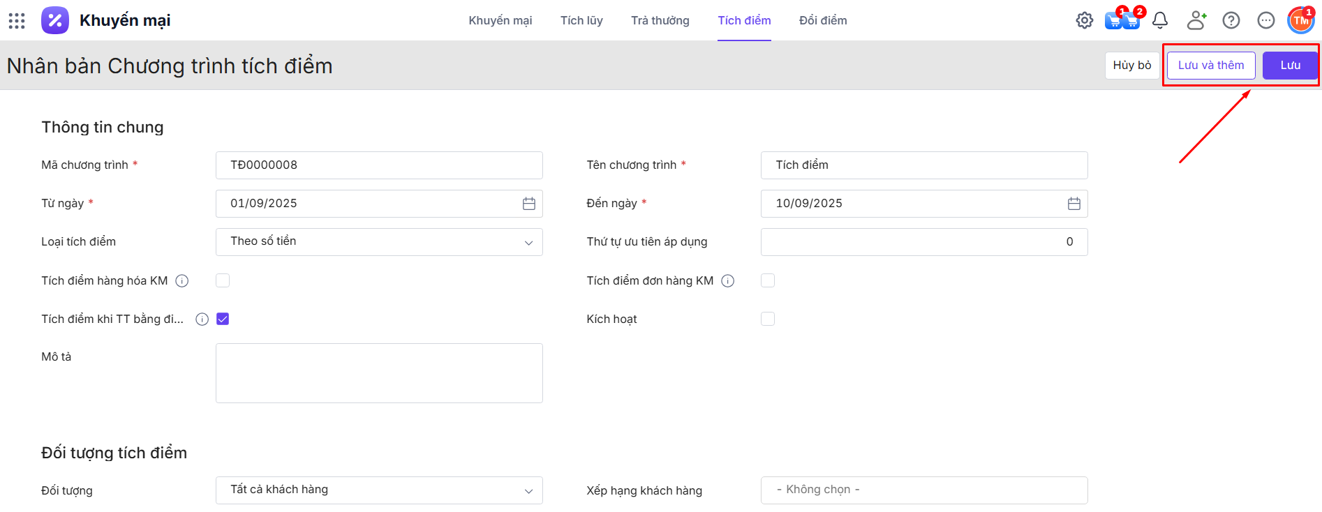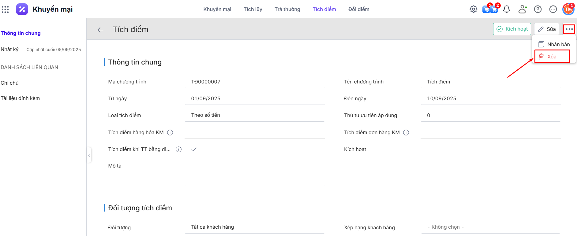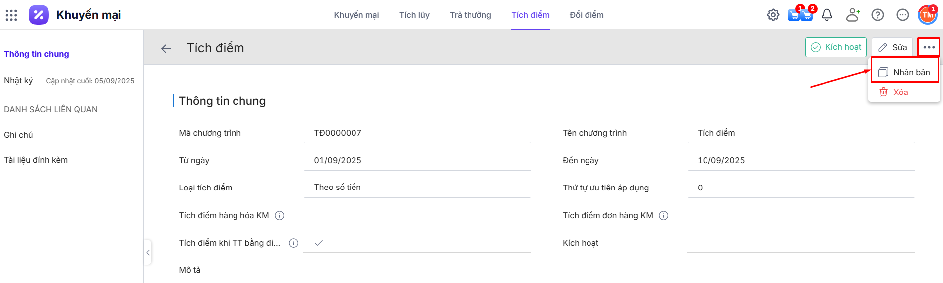 Bước 1: Tại chi tiết bản ghi chương trình tích điểm\ Nhấn biểu tượng dấu ba chấm