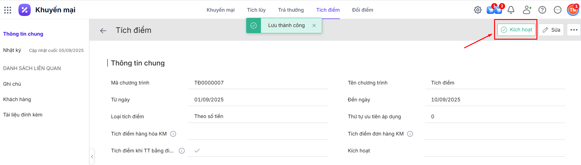 Tại chi tiết Chương trình tích điểm chưa kích hoạt\ Nhấn Kích hoạt.