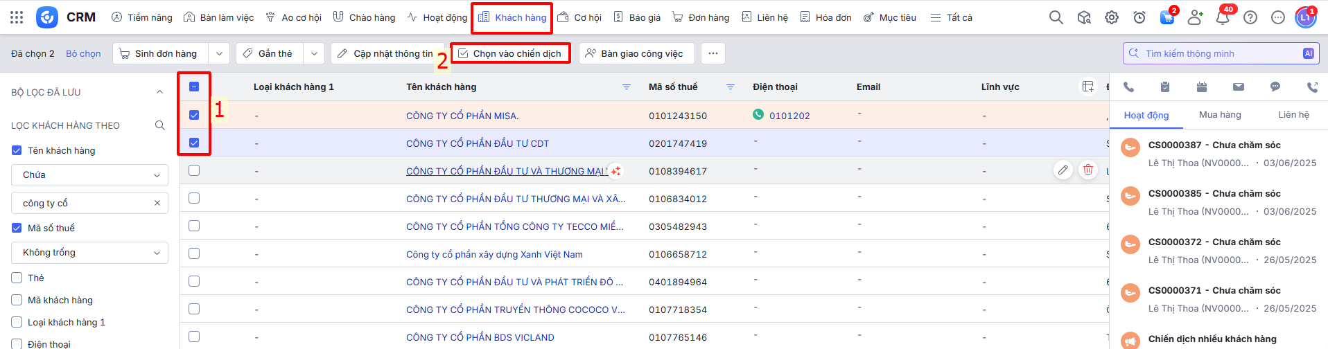 Ví dụ: Ở màn hình danh sách Khách hàng, chọn Khách hàng vào Chiến dịch. Danh sách Chiến dịch hiển thị các chiến dịch có đối tượng chào hàng là Khách hàng và Không chọn.